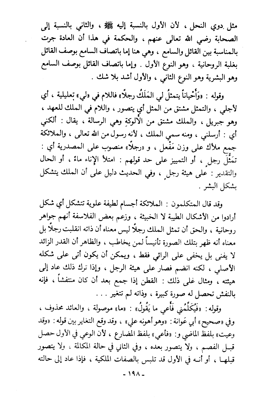 وقد قال المتكلمون: الملائكة أجسام لطيفة علوية تتشكل أي شكل أرادوا من الأشكال الطيبة لا الخبيثة، وزعم بعض الفلاسفة أنهم جواهر روحانية، والحق أن تمثل الملك رجلًا ليس معناه أن ذاته انقلبت رجلًا بل معناه أنه ظهر بتلك الصورة تأنيسًا لمن يخاطب، والظاهر أن القدر الزائد لا يفنى بل يخفى على الرائي فقط، ويمكن أن يكون أتى على شكله الأصلي، لكنه انضم فصار على هيئة الرجل، وإذا ترك ذلك عاد إلى هيئته، ومثال على ذلك: القطن إذا جمع بعد أن كان منتفشًا، فإنه بالنفش تحصل له صورة كبيرة، وذاته لم تتغير ...