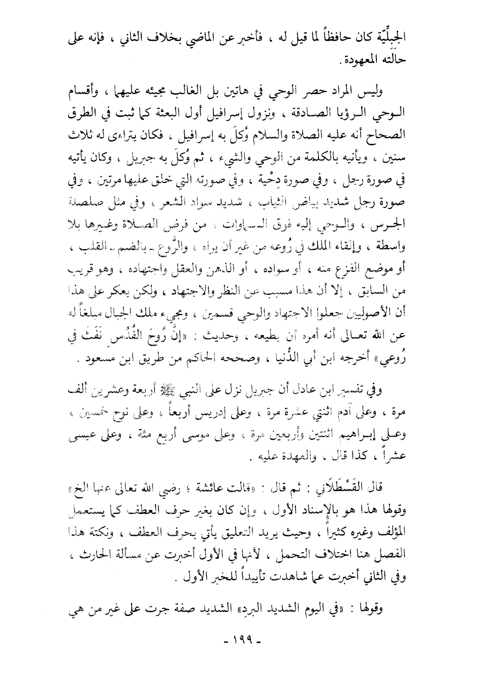 وليس المراد حصر الوحي في هاتين بل الغالب مجيئه عليهما, وأقسام الوحي الرؤيا الصادقة, ونزول إسرافيل أول البعثة كما ثبت في الطريق الصحاح أنه عليه الصلاة والسلام وُكلَ به إسرافيل, فكان يتراءى له ثلاث سنين, ويأتيه بالكلمة من الوحي والشيء, ثم وُكلَ به جبريل, وكان يأتيه في صورة رجل, وفي صورة دِحْيةّ, وفي صورته التي خلق عليها مرتين, وفي صورة رجل شديد بياض الثياب, شديد سواد الشعر, وفي مثل صلصلة الجرس, والوحي إليه فوق السماوات, من فرض الصلاة وغيرها بلا واسطة, وإلقاء الملك في رُوعه من غير أن يراه, والرُّوع -بالضم- القلب, أو موضع الفزع منه، أو سواده، أو الذهن والعقل واجتهاده، وهو قريب من السابق, إلا أن هذا مسبب عن النظر والاجتهاد , ولكن يعكر على هذا أن الأصوليين جعلوا الاجتهاد والوحي قسمين, ومجيء ملك الجبال مبلغًا له عن الله تعالى أنه أمره أن يطيعه, وحديث: "إنَّ رُوحَ القُدُسِ نَفَثَ في رُوعي" أخرجه ابن أبي الدُّنيا, وصححه الحاكم من طريق ابن مسعود.