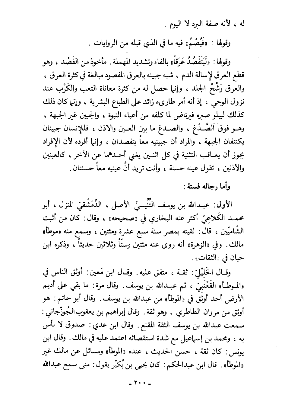الأول: عبد الله بن يوسف التِّنِّيسيِّ الأصل، الدِّمَشْقيّ المنزل، أبو محمَّد الكَلاعِيّ أكثر عنه البخاري في "صحيحه"، وقال: كان من أثبت الشّاميّين، قال: لقيته بمصر سنة سبع عشرة ومئتين، وسمع منه "موطأ" مالك. وفي "الزهرة" أنه روى عنه مئتين وستًّا وثلاثين حديثًا، وذكره ابن حبان في "الثقات".