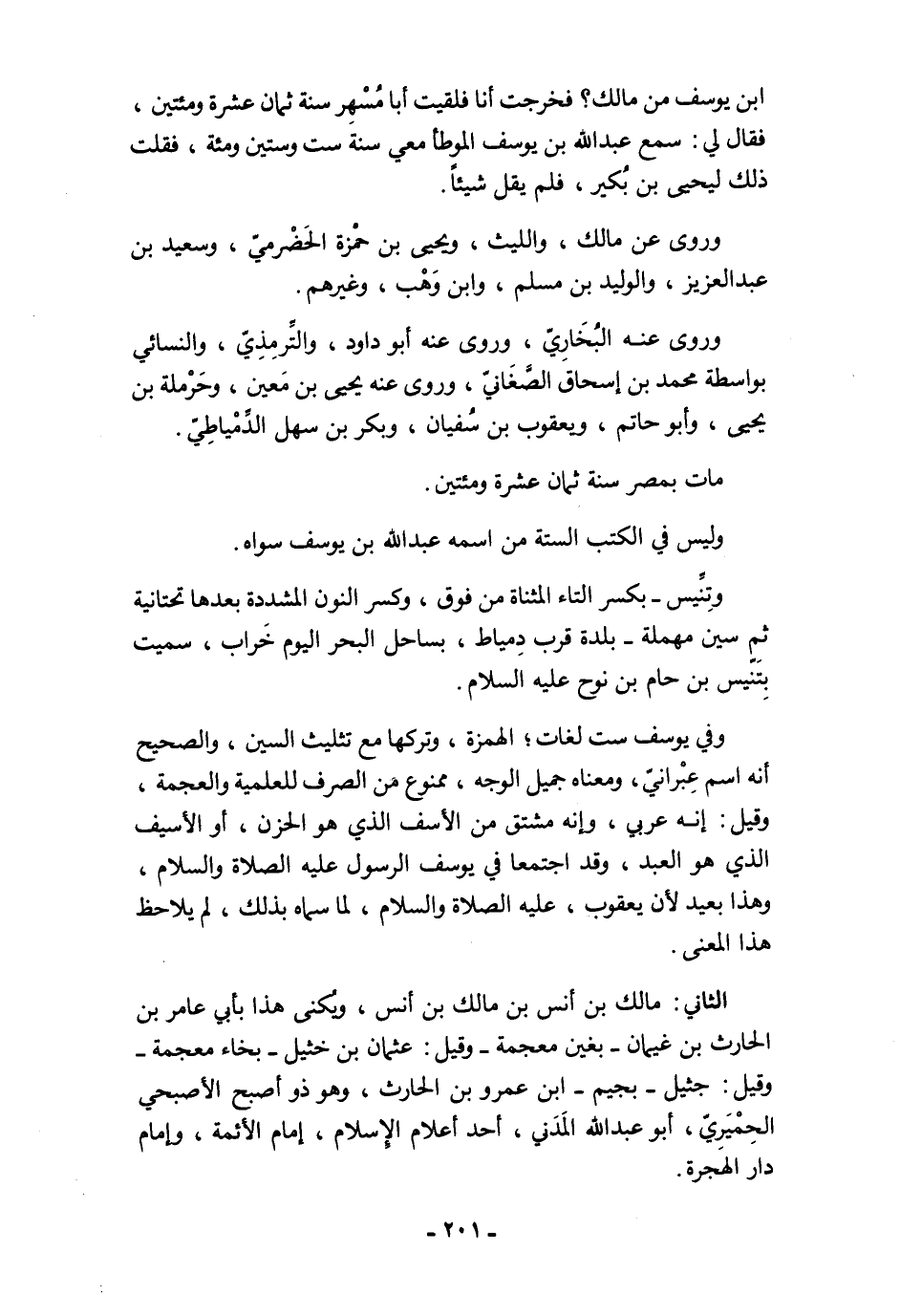 ابن يوسف من مالك؟ فخرجت أنا فلقيت أبا مُسْهِر سنة ثمان عشرة ومئتين، فقال لي: سمع عبد الله بن يوسف الموطأ معي سنة ست وستين ومئة، فقلت ذلك ليحيى بن بُكير، فلم يقل شيئًا.