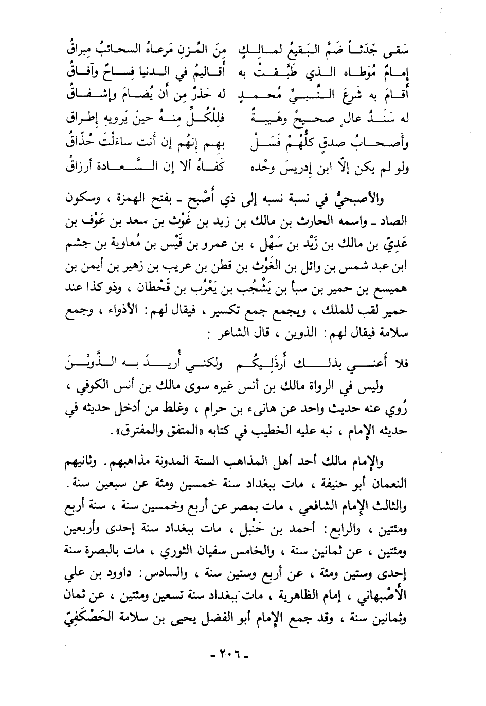 والإِمام مالك أحد أهل المذاهب الستة المدونة مذاهبهم. وثانيهم النعمان أبو حنيفة، مات ببغداد سنة خمسين ومئة عن سبعين سنة.