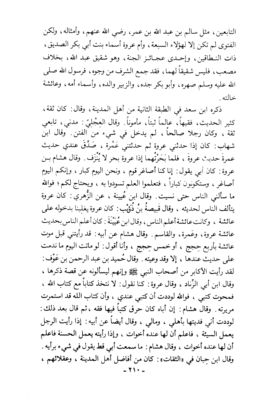 التابعين، مثل سالم بن عبد الله بن عمر، رضي الله عنهم، وأمثاله، ولكن الفتوى لم تكن إلا لهؤلاء السبعة، وأم عروة أسماء بنت أبي بكر الصديق، ذات النطاقين، وإحدى عجائز الجنة، وهو شقيق عبد الله، بخلاف مصعب، فليس شقيقًا لهما، فقد جمع الشرف من وجوه، فرسول الله صلى الله عليه وسلم صهره، وأبو بكر جده، والزبير والده، وأسماء أمه، وعائشة خالته.