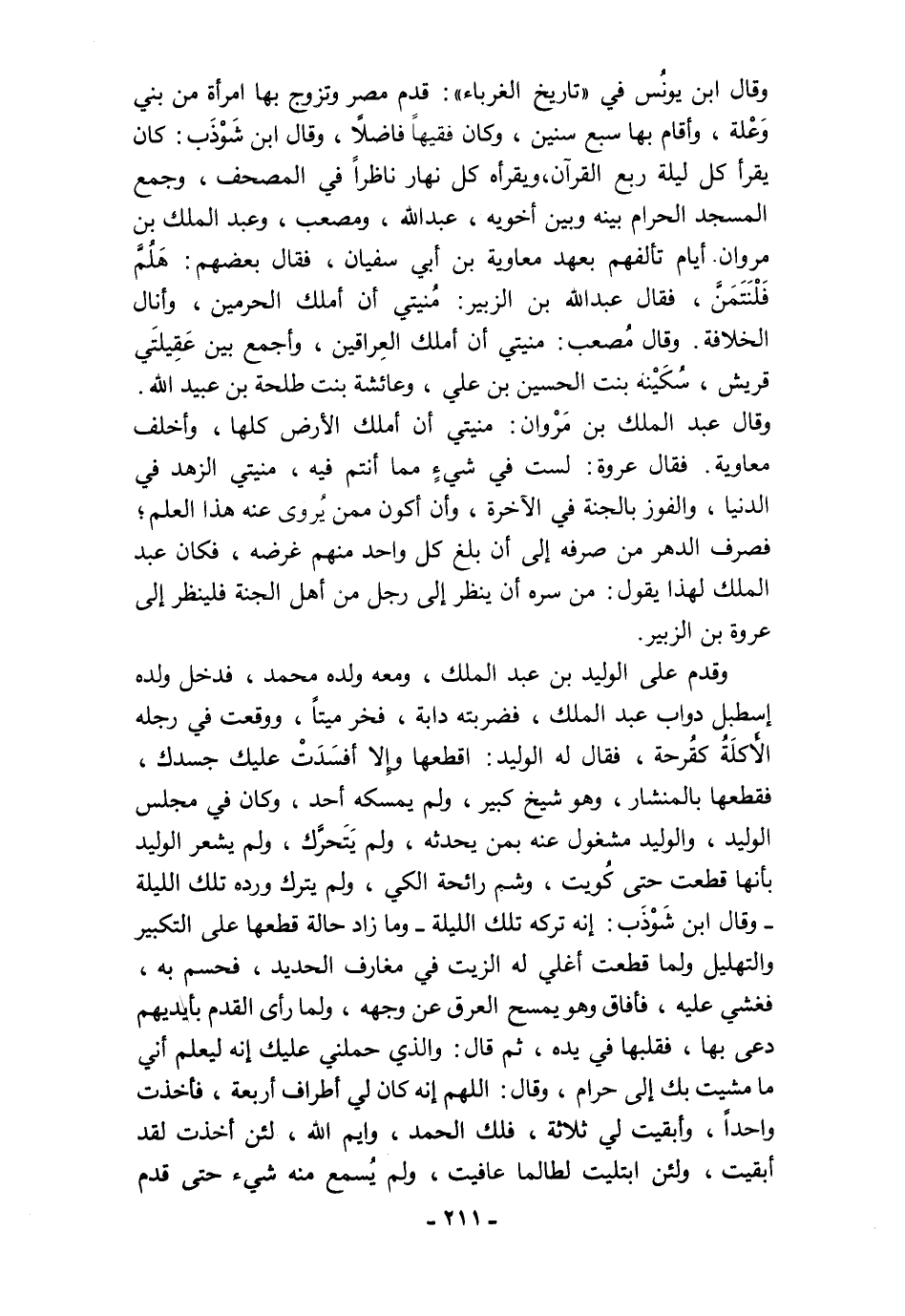 وقال عبد الملك بن مَرْوان: منيتي أن أملك الأرض كلها، وأخلف معاوية. فقال عروة: لست في شيءٍ مما أنتم فيه، منيتي الزهد في الدنيا، والفوز بالجنة في الآخرة، وأن أكون ممن يُروى عنه هذا العلم؛ فصرف الدهر من صرفه إلى أن بلغ كل واحد منهم غرضه، فكان عبد الملك لهذا يقول: من سره أن ينظر إلى رجل من أهل الجنة فلينظر إلى عروة بن الزبير.