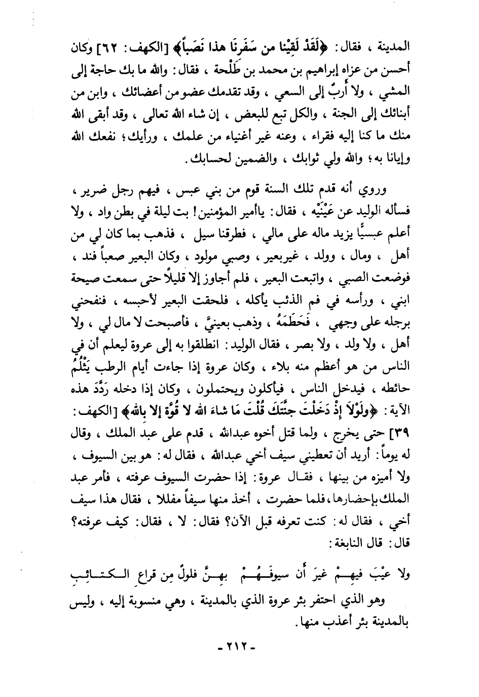 وروي أنه قدم تلك السنة قوم من بني عبس، فيهم رجل ضرير، فسأله الوليد عن عَيْنَيْه، فقال: يا أمير المؤمنين! بت ليلة في بطن واد، ولا أعلم عبسيًّا يزيد ماله على مالي، فطرقنا سيل، فذهب بما كان لي من أهل، ومال، وولد، غير بعير، وصبي مولود، وكان البعير صعبًا فند، فوضعت الصبي، واتبعت البعير، فلم أجاوز إلا قليلًا حتى سمعت صيحة ابني، ورأسه في فم الذئب يأكله، فلحقت البعير لأحبسه، فنفحني برجله على وجهي، فَحَطَمَهُ، وذهب بعينى، فأصبحت لا مال لي، ولا أهل، ولا ولد، ولا بصر، فقال الوليد: انطلقوا به إلى عروة ليعلم أن في الناس من هو أعظم منه بلاءً، وكان عروة إذا جاءت أيام الرطب يَثْلُمُ حائطه، فيدخل الناس، فيأكلون ويحتملون، وكان إذا دخله رَدَّدَ هذه الآية: {وَلَوْلَا إِذْ دَخَلْتَ جَنَّتَكَ قُلْتَ مَا شَاءَ اللَّهُ لَا قُوَّةَ إِلَّا بِاللَّهِ} [الكهف: 39] حتى يخرج، ولما قتل أخوه عبد الله، قدم على عبد الملك، وقال له يومًا: أريد أن تعطيني سيف أخي عبد الله، فقال له: هو بين السيوف، ولا أميزه من بينها، فقال عروة: إذا حضرت السيوف عرفته، فأمر عبد الملك بإحضارها، فلما حضرت، أخذ منها سيفًا مفللا، فقال هذا سيف أخي، فقال له: كنت تعرفه قبل الآن؟ فقال: لا، فقال: كيف عرفته؟ قال: قال النابغة: