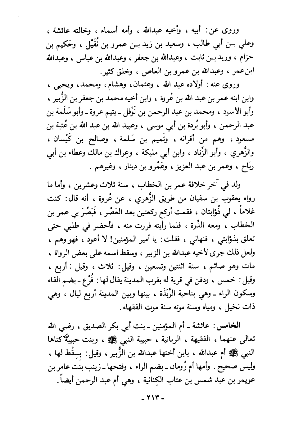 الخامس: عائشة -أم المؤمنين- بنت أبي بكر الصديق، رضي الله تعالى عنهما، الفقيهة، الربانية، حبيبة النبي - صلى الله عليه وسلم -، وبنت حبيبه كناها النبي - صلى الله عليه وسلم - أم عبد الله، بابن أختها عبد الله بن الزُّبير، وقيل: بِسِقْط لها، وليس صحيح. وأمها أم رُومان -بضم الراء، وفتحها- زينب بنت عامر بن عويمر بن عبد شمس بن عتاب الكِنانية، وهي أم عبد الرحمن أيضًا.