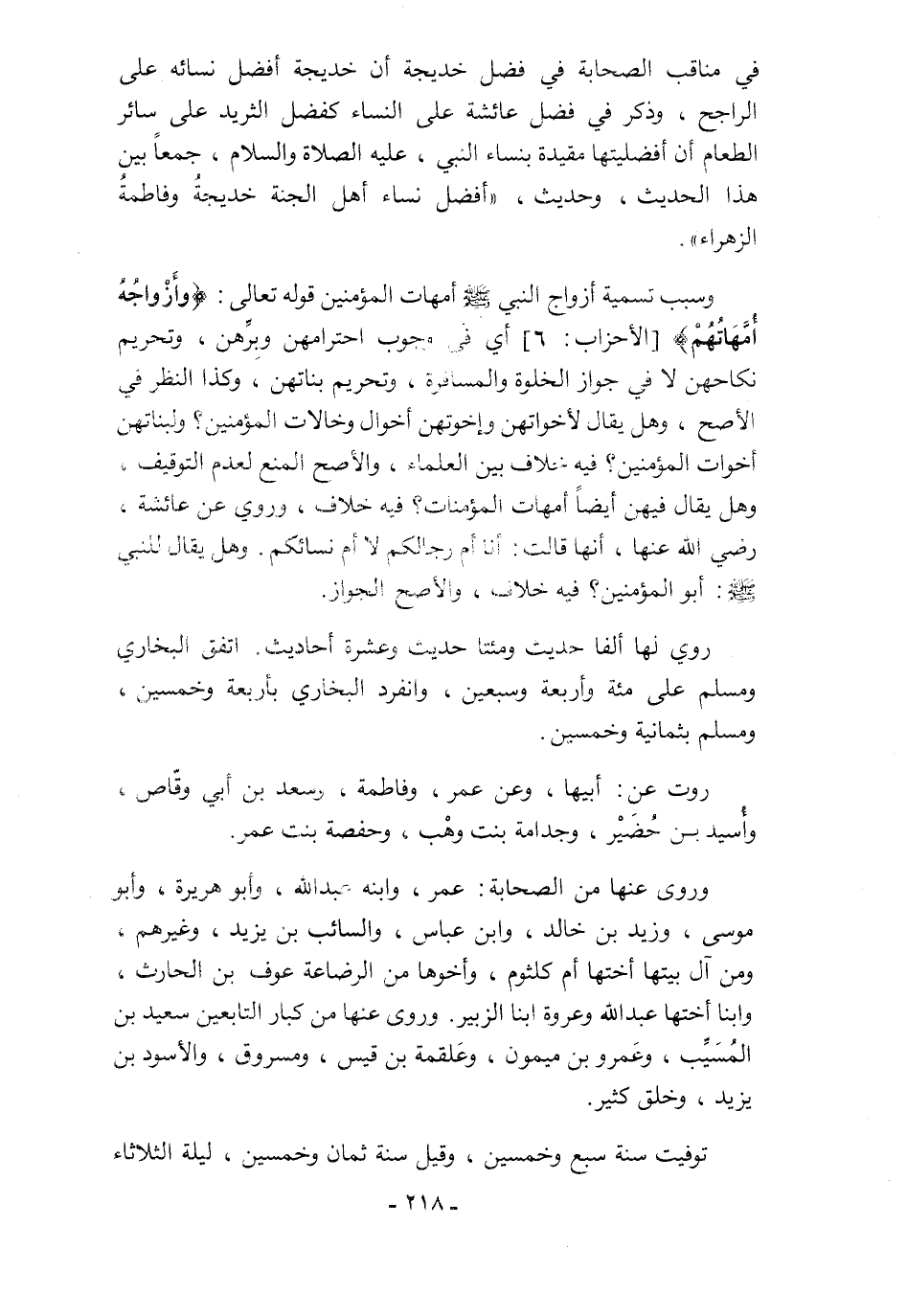 وسبب تسمية أزواج النبي - صلى الله عليه وسلم - أمهات المؤمنين قوله تعالى: {وَأَزْوَاجُهُ أُمَّهَاتُهُمْ} [الأحزاب: 6] أي في وجوب احترامهن وبِرِّهن , وتحريم نكاحهن لا في جواز الخلوة والمسافرة، وتحريم بناتهن, وكذا النظر في الأصح، وهل يقال لأخواتهن وإخوتهن أخوال وخالات المؤمنين؟ ولبناتهن أخوات المؤمنين؟ فيه خلاف بين العلماء, والأصح المنع لعدم التوقيف, وهل يقال فيهن أيضًا أمهات المؤمنات؟ فيه خلاف , وروي عن عائشة, رضي الله عنها, أنها قالت: أنا أم رجالكم لا أم نسائكم. وهل يقال للنبي - صلى الله عليه وسلم -: أبو المؤمنين؟ فيه خلاف, والأصح الجواز.