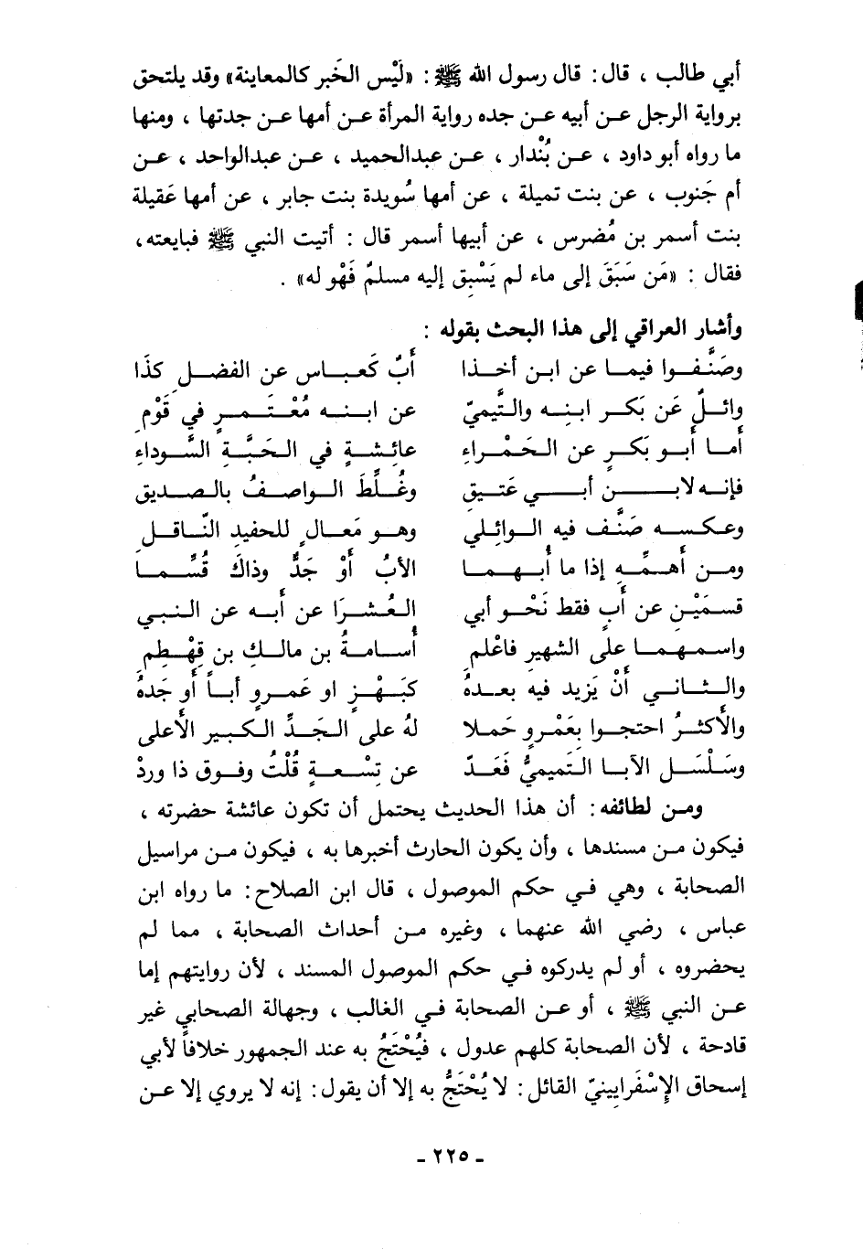 أبي طالب، قال: قال رسول الله - صلى الله عليه وسلم -: "ليْس الخَبر كالمعاينة" وقد يلتحق برواية الرجل عن أبيه عن جده رواية المرأة عن أمها عن جدتها، ومنها ما رواه أبو داود، عن بُنْدار، عن عبد الحميد، عن عبد الواحد، عن أم جَنوب، عن بنت تميلة، عن أمها سُويدة بنت جابر، عن أمها عَقيلة بنت أسمر بن مُضرس، عن أبيها أسمر قال: أتيت النبي - صلى الله عليه وسلم - فبايعته، فقال: "مَن سَبَقَ إلى ماء لم يَسْبِق إليه مسلمٌ فَهْو له".