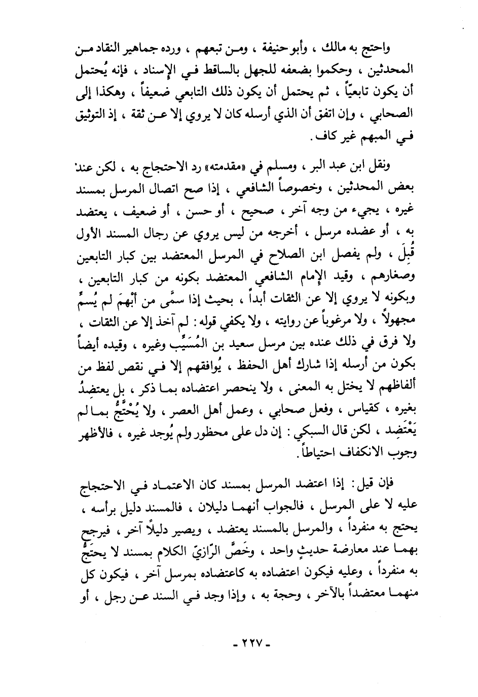 ونقل ابن عبد البر، ومسلم في "مقدمته" رد الاحتجاج به، لكن عند بعض المحدثين، وخصوصًا الشافعي، إذا صح اتصال المرسل بمسند غيره، يجيء من وجه آخر، صحيح، أو حسن، أو ضعيف، يعتضد به، أو عضده مرسل، أخرجه من ليس يروي عن رجال المسند الأول قُبِلَ، ولم يفصل ابن الصلاح في المرسل المعتضد بين كبار التابعين وصغارهم، وقيد الإِمام الشافعي المعتضد بكونه من كبار التابعين، وبكونه لا يروي إلا عن الثقات أبدًا، بحيث إذا سمَّى من أبْهمَ لم يُسمِّ مجهولًا, ولا مرغوبًا عن روايته، ولا يكفي قوله: لم آخذ إلا عن الثقات، ولا فرق في ذلك عنده بين مرسل سعيد بن المُسَيِّب وغيره، وقيده أيضًا بكون من أرسله إذا شارك أهل الحفظ، يُوافقهم إلا في نقص لفظ من ألفاظهم لا يختل به المعنى، ولا ينحصر اعتضاده بما ذكر، بل يعتضِدُ بغيره، كقياس، وفعل صحابي، وعمل أهل العصر، ولا يُحْتَّجُّ بما لم يَعْتَضِد، لكن قال السبكي: إن دل على محظور ولم يُوجد غيره، فالأظهر وجوب الانكفاف احتياطًا.