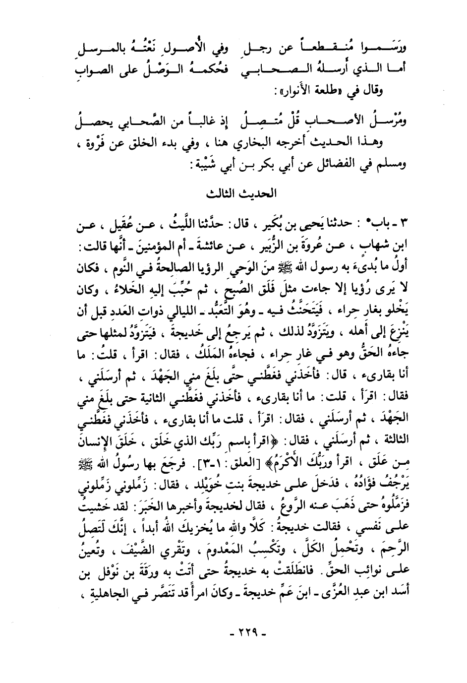 3 - باب *: حَدَّثَنَا يَحْيَى بْنُ بُكَيْرٍ، قَالَ: حَدَّثَنَا اللَّيْثُ، عَنْ عُقَيْلٍ، عَنِ ابْنِ شِهَابٍ، عَنْ عُرْوَةَ بْنِ الزُّبَيْرِ، عَنْ عَائِشَةَ -أُمِّ الْمُؤْمِنِينَ- أَنَّهَا قَالَتْ: أَوَّلُ مَا بُدِئَ بِهِ رَسُولُ اللَّهِ - صلى الله عليه وسلم - مِنَ الْوَحْيِ الرُّؤْيَا الصَّالِحَةُ فِى النَّوْمِ، فَكَانَ لاَ يَرَى رُؤْيَا إِلاَّ جَاءَتْ مِثْلَ فَلَقِ الصُّبْحِ، ثُمَّ حُبِّبَ إِلَيْهِ الْخَلاَءُ، وَكَانَ يَخْلُو بِغَارِ حِرَاءٍ، فَيَتَحَنَّثُ فِيهِ -وَهُوَ التَّعَبُّدُ- اللَّيَالِىَ ذَوَاتِ الْعَدَدِ قَبْلَ أَنْ يَنْزِعَ إِلَى أَهْلِهِ، وَيَتَزَوَّدُ لِذَلِكَ، ثُمَّ يَرْجِعُ إِلَى خَدِيجَةَ، فَيَتَزَوَّدُ لِمِثْلِهَا حَتَّى جَاءَهُ الْحَقُّ وَهُوَ فِى غَارِ حِرَاءٍ، فَجَاءَهُ الْمَلَكُ، فَقَالَ: اقْرَأْ، قَلتُ: مَا أَنَا بِقَارِئٍ، قَالَ: فَأَخَذَنِي فَغَطَّنِي حَتَّى بَلَغَ مِنِّي الْجَهْدَ، ثُمَّ أَرْسَلَنِي، فَقَالَ: اقْرَأْ، قُلْتُ: مَا أَنَا بِقَارِئٍ، فَأَخَذَنِي فَغَطَّنِي الثَّانِيَةَ حَتَّى بَلَغَ مِنِّي الْجَهْدَ، ثُمَّ أَرْسَلَنِي، فَقَالَ: اقْرَأْ، قُلْتُ مَا أَنَا بِقَارِئٍ، فَأَخَذَنِي فَغَطَّنِي الثَّالِثَةَ، ثُمَّ أَرْسَلَنِي، فَقَالَ: {اقْرَأْ بِاسْمِ رَبِّكَ الَّذِي خَلَقَ (1) خَلَقَ الْإِنْسَانَ مِنْ عَلَقٍ (2) اقْرَأْ وَرَبُّكَ الْأَكْرَمُ} [العلق: 1 - 3]. فَرَجَعَ بِهَا رَسُولُ اللَّهِ - صلى الله عليه وسلم - يَرْجُفُ فُؤَادُهُ، فَدَخَلَ عَلَى خَدِيجَةَ بِنْتِ خُوَيْلِدٍ، فَقَالَ: زَمِّلُونِي زَمِّلُونِي فَزَمَّلُوهُ حَتَّى ذَهَبَ عَنْهُ الرَّوْعُ، فَقَالَ لِخَدِيجَةَ وَأَخْبَرَهَا الْخَبَرَ: لَقَدْ خَشِيتُ عَلَى نَفْسِي، فَقَالَتْ خَدِيجَةُ: كَلاَّ وَاللَّهِ مَا يُخْزِيكَ اللَّهُ أَبَدًا، إِنَّكَ لَتَصِلُ الرَّحِمَ، وَتَحْمِلُ الْكَلَّ، وَتَكْسِبُ الْمَعْدُومَ، وَتَقْرِي الضَّيْفَ، وَتُعِينُ عَلَى نَوَائِبِ الْحَقِّ. فَانْطَلَقَتْ بِهِ خَدِيجَةُ حَتَّى أَتَتْ بِهِ وَرَقَةَ بْنَ نَوْفَلِ بْنِ أَسَدِ بْنِ عَبْدِ الْعُزَّى -ابْنَ عَمِّ خَدِيجَةَ- وَكَانَ امْرَأً قد تَنَصَّرَ فِى الْجَاهِلِيَّةِ،