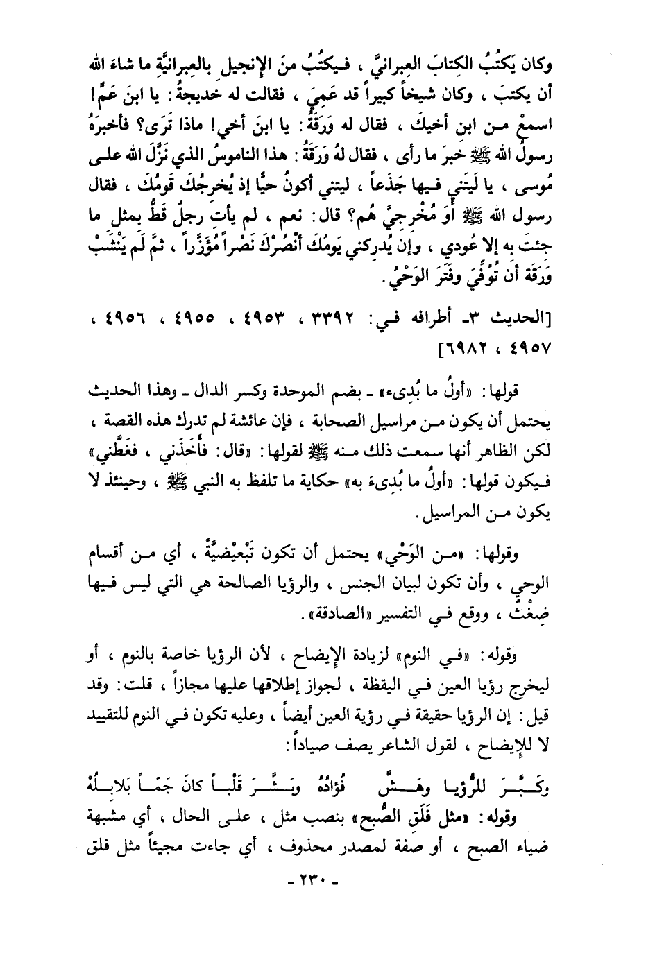وَكَانَ يَكْتُبُ الْكِتَابَ الْعِبْرَانِيَّ، فَيَكْتُبُ مِنَ الإِنْجِيلِ بِالْعِبْرَانِيَّةِ مَا شَاءَ اللَّهُ أَنْ يَكْتُبَ، وَكَانَ شَيْخًا كَبِيرًا قَدْ عَمِيَ، فَقَالَتْ لَهُ خَدِيجَةُ: يَا ابْنَ عَمِّ! اسْمَعْ مِنَ ابْنِ أَخِيكَ، فَقَالَ لَهُ وَرَقَةُ: يَا ابْنَ أَخِي! مَاذَا تَرَى؟ فَأَخْبَرَهُ رَسُولُ اللَّهِ - صلى الله عليه وسلم - خَبَرَ مَا رَأَى، فَقَالَ لَهُ وَرَقَةُ: هَذَا النَّامُوسُ الَّذِي نَزَّلَ اللَّهُ عَلَى مُوسَى، يَا لَيْتَنِي فِيهَا جَذَعًا، لَيْتَنِي أَكُونُ حَيًّا إِذْ يُخْرِجُكَ قَوْمُكَ، فَقَالَ رَسُولُ اللَّهِ - صلى الله عليه وسلم - أَوَ مُخْرِجِيَّ هُمْ؟ قَالَ: نَعَمْ، لَمْ يَأْتِ رَجُلٌ قَطُّ بِمِثْلِ مَا جِئْتَ بِهِ إِلاَّ عُودِيَ، وَإِنْ يُدْرِكْنِي يَوْمُكَ أَنْصُرْكَ نَصْرًا مُؤَزَّرًا، ثُمَّ لَمْ يَنْشَبْ وَرَقَةُ أَنْ تُوُفِّيَ وَفَتَرَ الْوَحْيُ.