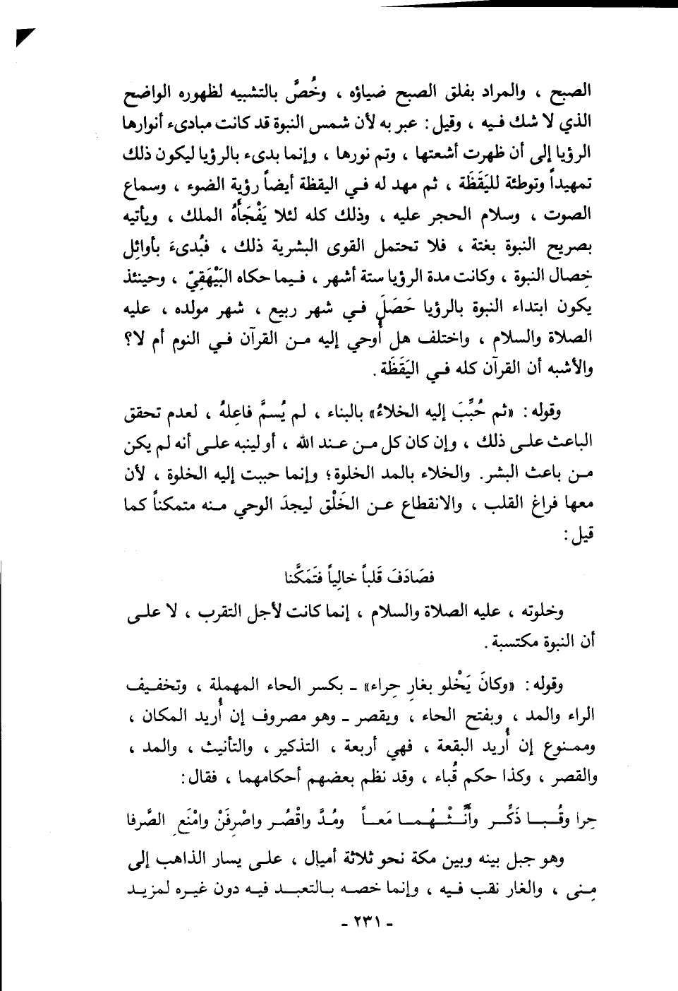وقوله: "وكانَ يَخْلو بغارِ حِراء" -بكسر الحاء المهملة، وتخفيف الراء والمد، وبفتح الحاء، ويقصر- وهو مصروف إن أُريد المكان، وممنوع إن أُريد البقعة، فهي أربعة، التذكير، والتأنيث، والمد، والقصر، وكذا حكم قُباء، وقد نظم بعضهم أحكامهما، فقال: