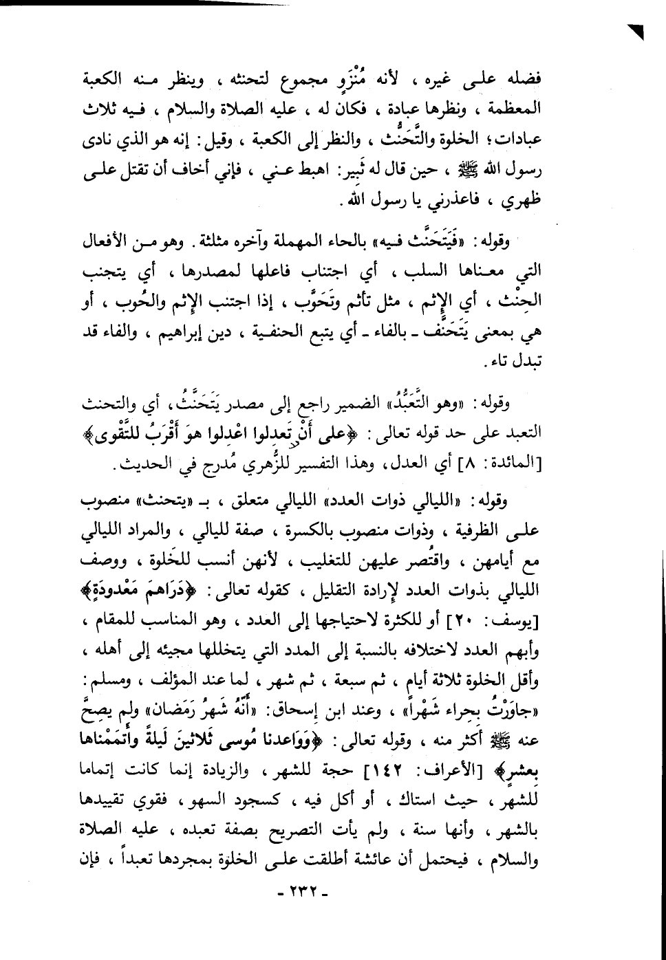 وقوله: "الليالي ذوات العدد" الليالي متعلق، بـ "يتحنث" منصوب على الظرفية، وذوات منصوب بالكسرة، صفة لليالي، والمراد الليالي مع أيامهن، واقتُصر عليهن للتغليب, لأنهن أنسب للخَلوة، ووصف الليالي بذوات العدد لإِرادة التقليل، كقوله تعالى: {دَرَاهِمَ مَعْدُودَةٍ} [يوسف: 20] أو للكثرة لاحتياجها إلى العدد، وهو المناسب للمقام، وأبهم العدد لاختلافه بالنسبة إلى المدد التي يتخللها مجيئه إلى أهله، وأقل الخلوة ثلاثة أيام، ثم سبعة، ثم شهر، لما عند المؤلف، ومسلم: "جاوَرْتُ بِحِراء شَهْرًا"، وعند ابن إِسحاق: "أَنّهُ شَهرُ رَمَضان" ولم يصِحَّ عنه - صلى الله عليه وسلم - أكثر منه، وقوله تعالى: {وَوَاعَدْنَا مُوسَى ثَلَاثِينَ لَيْلَةً وَأَتْمَمْنَاهَا بِعَشْرٍ} [الأعراف: 142] حجة للشهر، والزيادة إنما كانت إتماما للشهر، حيث استاك، أو أكل فيه، كسجود السهو، فقوي تقييدها بالشهر، وأنها سنة، ولم يأت التصريح بصفة تعبده، عليه الصلاة والسلام، فيحتمل أن عائشة أطلقت على الخلوة بمجردها تعبدًا، فإن