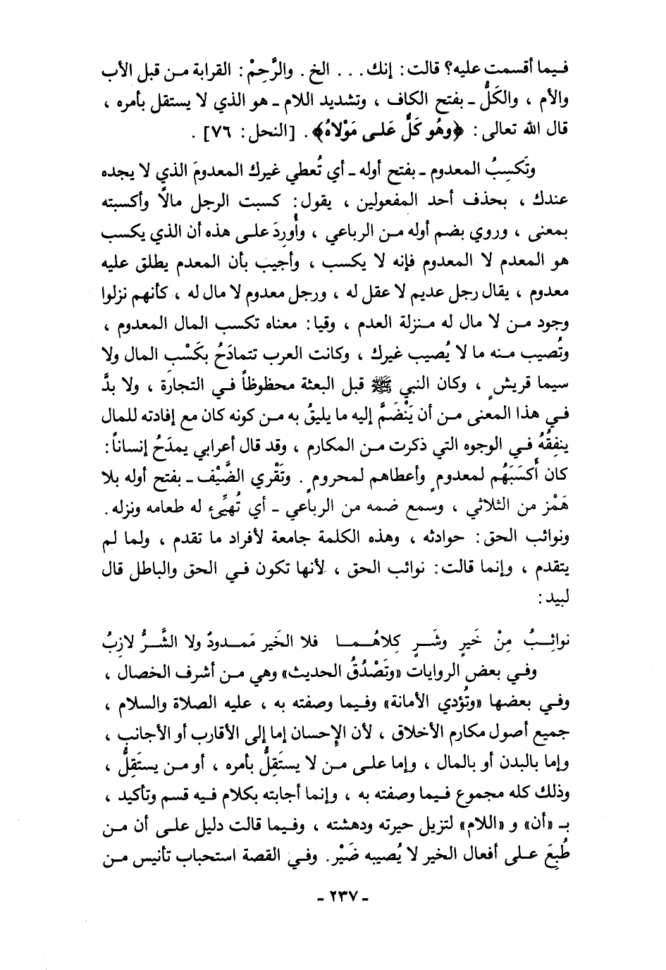 وتَكسِبُ المعدوم -بفتح أوله- أي تُعطي غيرك المعدومَ الذي لا يجده عندك، بحذف أحد المفعولين، يقول: كسبت الرجل مالًا وأكسبته بمعنى، وروي بضم أوله من الرباعي، وأُورِدَ على هذه أن الذي يكسب هو المعدم لا المعدوم فإنه لا يكسب، وأجيب بأن المعدم يطلق عليه معدوم، يقال رجل عديم لا عقل له، ورجل معدوم لا مال له، كأنهم نزلوا وجود من لا مال له منزلة العدم، وقيا: معناه تكسب المال المعدوم، وتُصيب منه ما لا يُصيب غيرك، وكانت العرب تتمادَحُ بكَسْبِ المال ولا سيما قريشٍ، وكان النبي - صلى الله عليه وسلم - قبل البعثة محظوظًا في التجارة، ولا بدَّ في هذا المعنى من أن يَنْضَمَّ إليه ما يليقُ به من كونه كان مع إفادته للمال ينفِقُهُ في الوجوه التي ذكرت من المكارم، وقد قال أعرابي يمدَحُ إنسانًا: كان أَكسَبَهُم لمعدومٍ وأعطاهم لمحرومٍ. وتَقْري الضَّيْف -بفتح أوله بلا هَمْز من الثلاثي، وسمع ضمه من الرباعي- أي تُهيِّئ له طعامه ونزله.