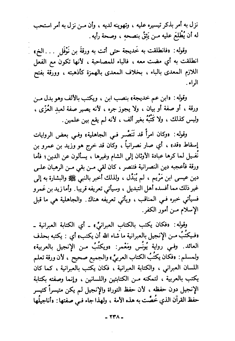 وقوله: "فكان يكتب بالكتابِ العبرانيِّ" -أي الكتابة العبرانية- "فيكتُبُ من الإِنجيل بالعبرانية ما شاء الله أن يكتب" أي: يكتبه بحذف العائد. وفي رواية يُونُس ومَعْمر: "ويكتُبُ من الإِنجيل بالعربية" ولمسلم: "فكان يكتُبُ الكتاب العربيَّ" والجميع صحيح, لأن ورقة تعلم اللسان العبراني، والكتابة العبرانية، فكان يكتب بالعبرانية، كما كان يكتب بالعربية، لتمكنه من الكتابتين واللسانين، وإنما وصفته بكتابة الإنجيل دون حفظه، لأن حفظ التوراة والإِنجيل لم يكن متيسرًا كتيسر حفظ القرآن الذي خُصَّت به هذه الأمة، ولهذا جاء في صفتها: "أناجيلُها
