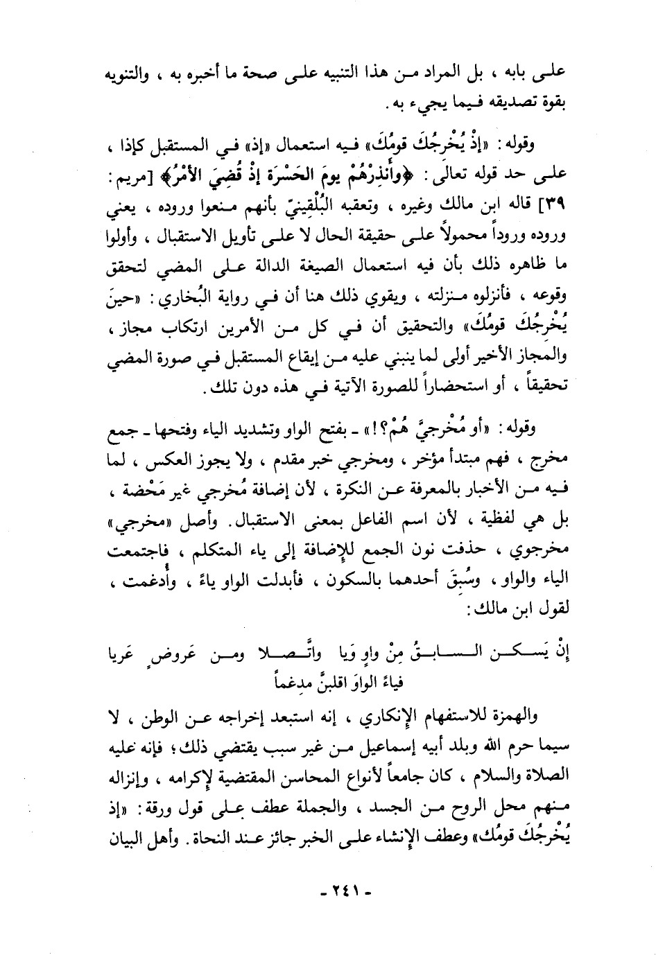 وقوله: "أو مُخْرجيَّ هُمْ؟! " -بفتح الواو وتشديد الياء وفتحها- جمع مخرج، فهم مبتدأ مؤخر، ومخرجي خبر مقدم، ولا يجوز العكس، لما فيه من الأخبار بالمعرفة عن النكرة، لأن إضافة مُخرجي غير مَحْضة، بل هي لفظية, لأن اسم الفاعل بمعنى الاستقبال. وأصل "مخرجي" مخرجوي، حذفت نون الجمع للإِضافة إلى ياء المتكلم، فاجتمعت الياء والواو، وسُبِقَ أحدهما بالسكون، فأبدلت الواو ياءً، وأُدغمت، لقول ابن مالك: