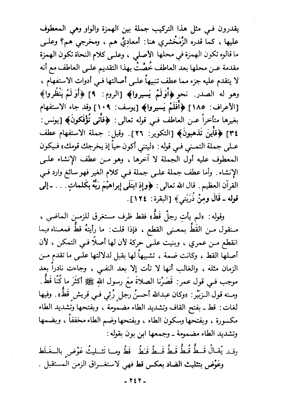 ومنه قول الزبَيْر: "وكان عبد الله أحسنُ رجلٍ رُئِي في قريشٍ قَطُّ". وفيها لغات: قط -بفتح القاف وتشديد الطاء مضمومة، وبفتحها وتشديد الطاء مكسورة، وبفتحها وسكون الطاء، وبفتحها وضم الطاء مخففًا، وبضمها وتشديد الطاء مضمومة- وجمعها ابن بون بقوله: