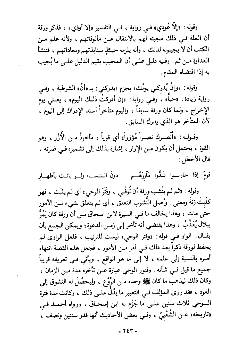 وقوله: "ثم لم يَنْشَب ورقة أن تُوفّي، وفَتَرَ الوحي" أي لم يلبَث، فهو كلَبِثَ زنةً ومعنى. وأصل النُّشوب التعلق، أي لم يتعلق بشيء من الأمور حتى مات، وهذا يخالف ما في السيرة لابن اسحاق من أن ورقة كان يَمُرُّ ببلال يُعَذَّبُ، وهذا يقتضي أنه تأخر إلى زمن الدعوة؛ ويمكن الجمع بأن يقال: الواو في قوله: "وفتر الوحي" ليست للترتيب، فلعل الراوي لم يحفظ لورقة ذكرًا بعد ذلك في أمر من الأمور، فجعل هذه القصة انتهاء أمره بالنسبة إلى علمه، لا إلى ما هو الواقع، ويأتي في تعريفه قريبًا جميع ما قيل في شأنه. وفتور الوحي عبارة عن تأخره مدة من الزمان، وكان ذلك ليذهب ما كان - صلى الله عليه وسلم - وجده من الرَّوعْ، وليحصُلَ له التشوق إلى العود، فقد روى المؤلف في التعبير ما يدُلُّ على ذلك، وكانت مدة فترة الوحي ثلاث سنين على ما جَزَم به ابن إسحاق، ورواه أحمد في "تاريخه" عن الشَّعْبِيّ، وفي بعض الأحاديث أنها قدر سنتين ونصف،
