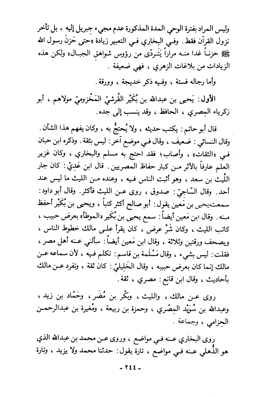 وقال النسائي: ضعيف، وقال في موضع آخر: ليس بثقة. وذكره ابن حبان في "الثقات"، وأصاب؛ فقد احتج به مسلم والبخاري، وكان غزير العلم عارفًا بالأثر من كبار حفاظ المصريين. قال ابن عَدِيّ: كان جار اللَّيث بن سعد، وهو أثبت الناس فيه، وعنده من الليث ما ليس عند أحد. وقال السّاجِيّ: صدوق، روى عن الليث فأكثر. وقال أبو داود: سمعت يحيى بن مَعين يقول: أبو صالح أكثر كتبًا، ويحيى بن بُكَيْر أحفظ منه. وقال ابن مَعين أيضًا: سمع يحيى بن بُكَير "الموطأ" بعرض حبيب، كاتب الليث، وكان شَرَّ عرض، كان يقرأ على مالك خطوط الناس، ويصحف ورقتين وثلاثة، وقال ابن مَعين أيضًا: سألني عنه أهل مصر، فقلت: ليس بشيء، وقال مَسْلَمة بن قاسم: تكلم فيه, لأن سماعه عن مالك إنما كان بعرض حبيبه، وقال الخَلِيليّ: كان ثقة، وتفرد عن مالك بأحاديث، وقال ابن قانِع: مصري، ثقة.