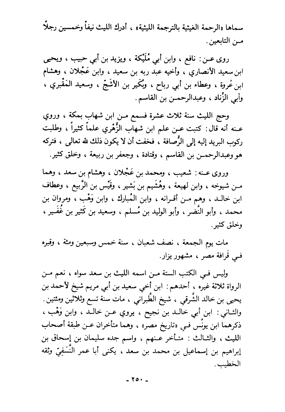 سماها "الرحمة الغيثية بالترجمة الليثية"، أدرك الليث نيفًا وخمسين رجلًا من التابعين.