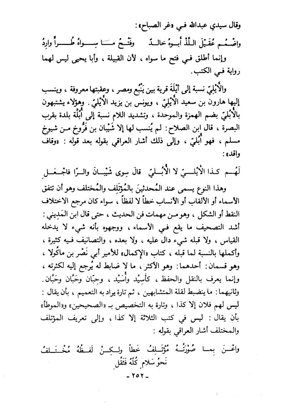 وثانيهما: ما ينضبط لقلة المتشابهين، ثم تارة يراد به التعميم، بأن يقال: ليس لهم فلان إلا كذا، وتارة به التخصيص بـ "الصحيحين" و"الموطأ" بأن يقال: ليس في كتب الثلاثة إلا كذا، وإلى تعريف المؤتلف والمختلف أشار العراقي بقوله: