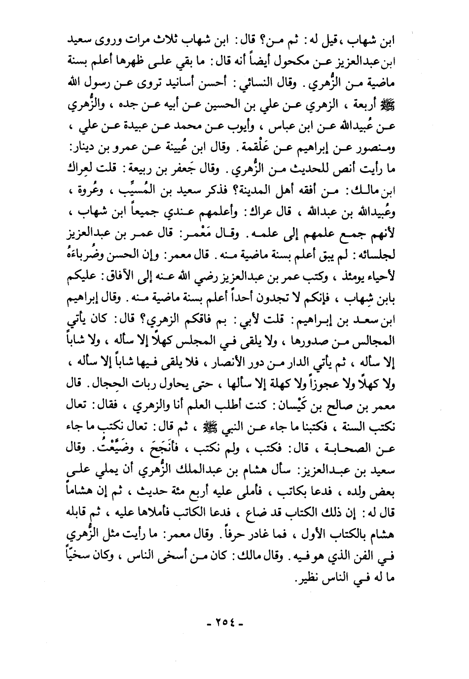 ابن شهاب، قيل له: ثم من؟ قال: ابن شهاب ثلاث مرات وروى سعيد ابن عبد العزيز عن مكحول أيضًا أنه قال: ما بقي على ظهرها أعلم بسنة ماضية من الزُّهري. وقال النسائي: أحسن أسانيد تروى عن رسول الله - صلى الله عليه وسلم - أربعة، الزهري عن علي بن الحسين عن أبيه عن جده، والزُّهري عن عُبيد الله عن ابن عباس، وأيوب عن محمَّد عن عبيدة عن علي، ومنصور عن إبراهيم عن عَلْقمة. وقال ابن عُيينة عن عمرو بن دينار: ما رأيت أنص للحديث من الزُّهري. وقال جَعفر بن ربيعة: قلت لعِراك ابن مالك: من أفقه أهل المدينة؟ فذكر سعيد بن المُسيِّب، وعُروة، وعُبيد الله بن عبد الله، قال عراك: وأعلمهم عندي جميعًا ابن شهاب، لأنهم جمع علمهم إلى علمه. وقال مَعْمر: قال عمر بن عبد العزيز لجلسائه: لم يبق أعلم بسنة ماضية منه. قال معمر: وإن الحسن وضُرباءَهُ لأحياء يومئذ، وكتب عمر بن عبد العزيز رضي الله عنه إلى الآفاق: عليكم بابن شِهاب، فإنكم لا تجدون أحدًا أعلم بسنة ماضية منه. وقال إبراهيم ابن سعد بن إبراهيم: قلت لأبي: بم فاقكم الزهري؟ قال: كان يأتي المجالس من صدورها، ولا يلقى في المجلس كهلًا إلا سأله, ولا شابًا إلا سأله، ثم يأتي الدار من دور الأنصار، فلا يلقى فيها شابًا إلا سأله، ولا كهلًا ولا عجوزًا ولا كهلة إلا سألها, حتى يحاول ربات الحِجال. قال معمر بن صالح بن كَيْسان: كنت أطلب العلم أنا والزهري، فقال: تعال نكتب السنة، فكتبنا ما جاء عن النبي - صلى الله عليه وسلم -, ثم قال: تعال نكتب ما جاء عن الصحابة، قال: فكتب، ولم نكتب، فأنَجَحَ، وضَيَّعْتُ. وقال سعيد بن عبد العزيز. سأل هشام بن عبد الملك الزُّهري أن يملي على بعض ولده، فدعا بكاتب، فأملى عليه أربع مئة حديث، ثم إن هشامًا قال له: إن ذلك الكتاب قد ضاع، فدعا الكاتب فأملاها عليه، ثم قابله هشام بالكتاب الأول، فما غادر حرفًا. وقال معمر: ما رأيت مثل الزُّهري في الفن الذي هو فيه. وقال مالك: كان من أسخى الناس، وكان سخيًّا ما له في الناس نظير.