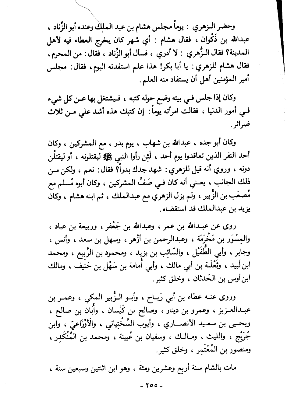 وحضر الزهري يومًا مجلس هشام بن عبد الملك وعنده أبو الزِّناد، عبد الله بن ذَكْوان، فقال هشام: أي شهر كان يخرج العطاء فيه لأهل المدينة؟ فقال الزُّهري: لا أدري، فسأل أبو الزِّناد، فقال: من المحرم، فقال هشام للزهري: يا أبا بكر! هذا علم استفدته اليوم، فقال: مجلس أمير المؤمنين أهل أن يستفاد منه العلم.