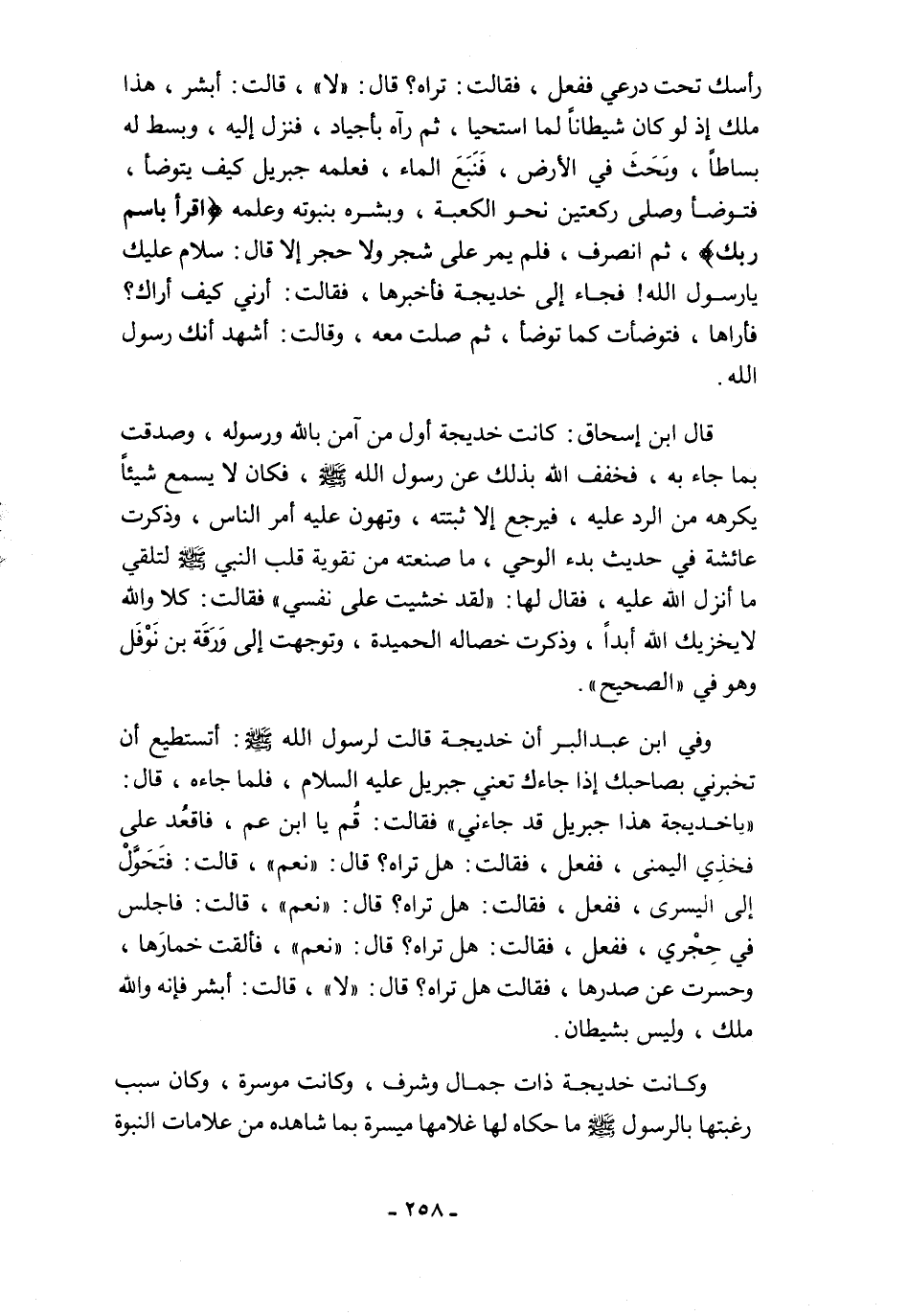 وفي ابن عبد البر أن خديجة قالت لرسول الله - صلى الله عليه وسلم -: أتستطيع أن تخبرني بصاحبك إذا جاءك تعني جبريل عليه السلام، فلما جاءه، قال: "يا خديجة هذا جبريل قد جاءني" فقالت: قُم يا ابن عم، فاقعُد على فخذِي اليمنى، ففعل، فقالت: هل تراه؟ قال: "نعم"، قالت: فتَحَوَّلْ إلى اليسرى، ففعل، فقالت: هل تراه؟ قال: "نعم"، قالت: فاجلس في حِجْري، ففعل، فقالت: هل تراه؟ قال: "نعم"، فألقت خمارَها، وحسرت عن صدرها، فقالت هل تراه؟ قال: "لا"، قالت: أبشر فإنه والله ملك، وليس بشيطان.