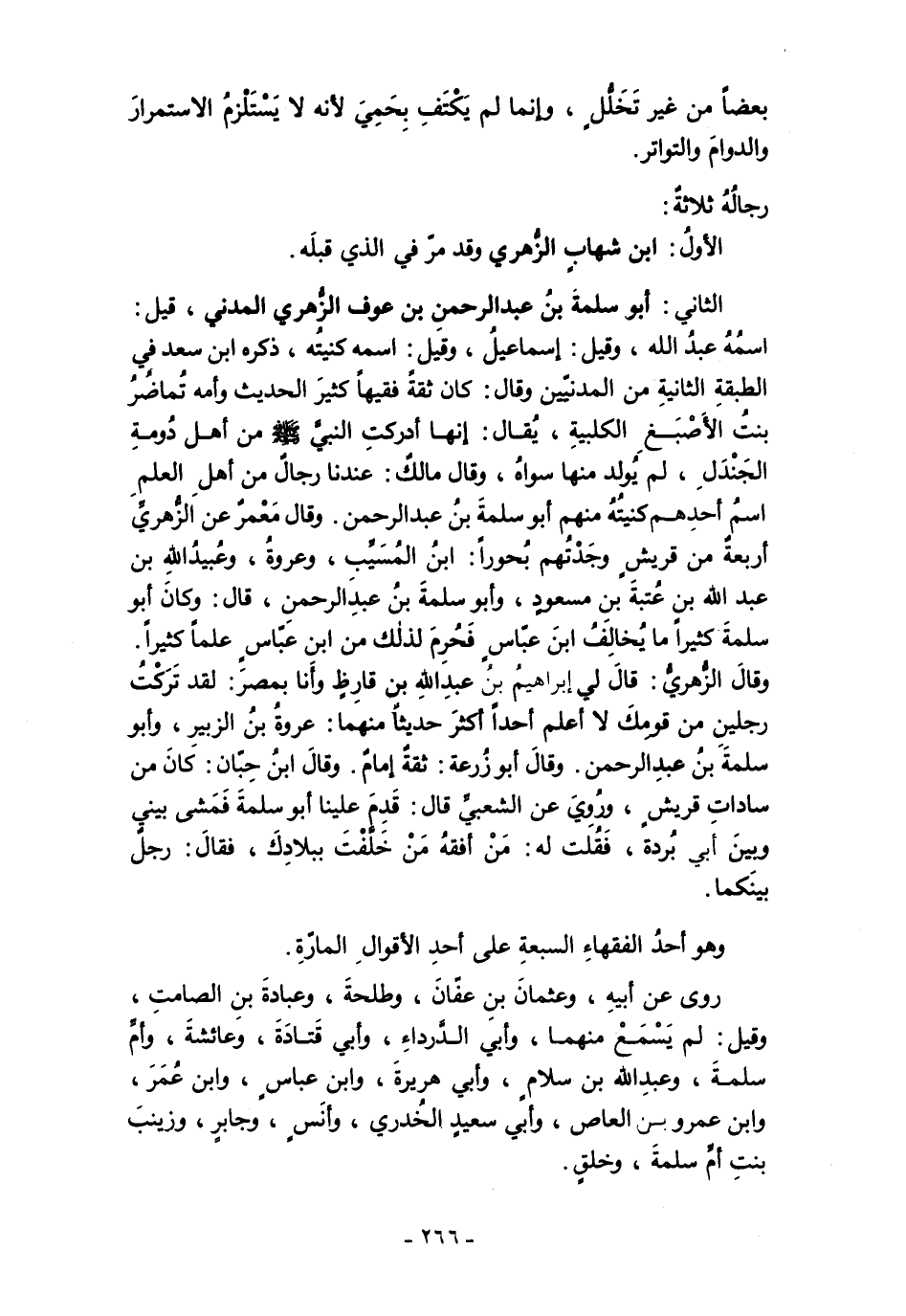 الثاني: أبو سلمة بنُ عبد الرحمنِ بن عوف الزُّهري المدني، قيل: اسمُهُ عبدُ الله، وقيل: إسماعيلُ، وقيل: اسمه كنيتُه، ذكره ابن سعد في الطبقةِ الثانيةِ من المدنيّين وقال: كان ثقةً فقيهًا كثيرَ الحديث وأمه تُماضرُ بنتُ الأَصْبَغ الكلبيةِ، يُقال: إنها أدركتِ النبيَّ - صلى الله عليه وسلم - من أهل دُومةِ الجَنْدَلِ، لم يُولد منها سواهُ، وقال مالكٌ: عندنا رجالٌ من أهلِ العلمِ اسمُ أحدِهم كنيتُهُ منهم أبو سلمةَ بنُ عبد الرحمن. وقال مَعْمرٌ عن الزُّهريِّ أربعةٌ من قريشٍ وجَدْتُهم بُحورًا: ابنُ المُسَيِّب، وعروةُ، وعُبيدُ الله بن عبد الله بن عُتبة بنِ مسعود، وأبو سلمةَ بنُ عبدِ الرحمن، قال: وكانَ أبو سلمةَ كثيرًا ما يُخالِفُ ابنَ عبّاسٍ فحُرِمَ لذلك من ابن عبّاسٍ علمًا كثيرًا.