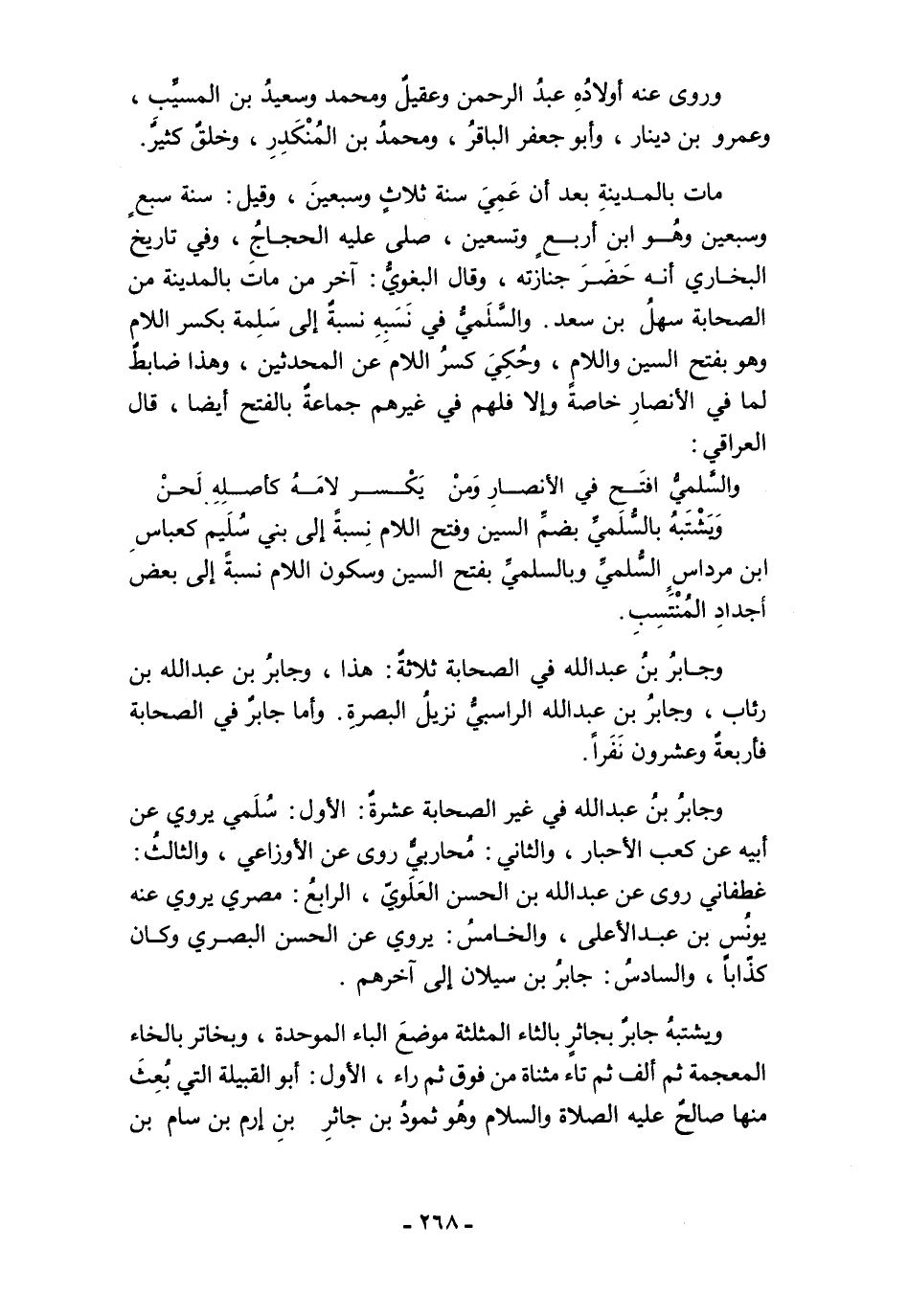 وجابرُ بنُ عبد الله في غير الصحابة عشرةٌ: الأول: سُلَمي يروي عن أبيه عن كعب الأحبار، والثاني: مُحاربيٌّ روى عن الأوزاعي، والثالثُ: غطفاني روى عن عبد الله بن الحسن العَلَويّ، الرابعُ: مصري يروي عنه يونُس بن عبد الأعلى، والخامسُ: يروي عن الحسن البصري وكان كذابًا، والسادسُ: جابرُ بن سيلان إلى آخرهم.