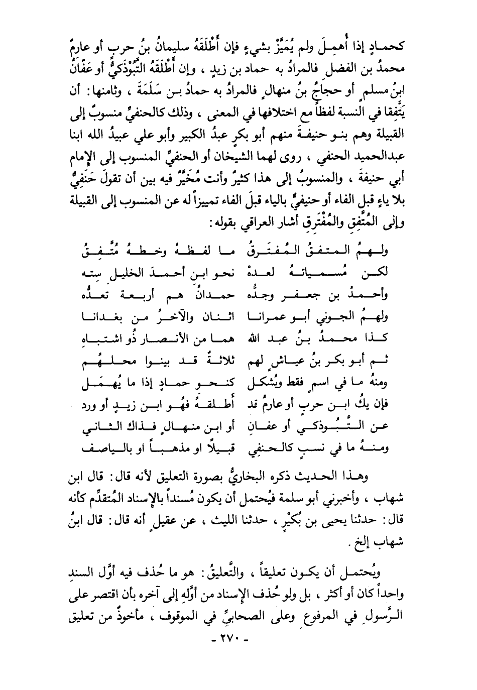 كحمادٍ إذا أُهمِلَ ولم يُمَيَّزْ بشيءٍ فإن أَطْلَقَهُ سليمانُ بنُ حربٍ أو عارِمٌ محمدُ بن الفضل فالمرادُ به حماد بن زيدٍ، وإن أَطْلَقَهُ التَّبُوْذَكيُّ أو عَفّانُ ابنُ مسلمٍ أو حجاجُ بنُ منهالٍ فالمرادُ به حمادُ بن سَلَمَةَ، وثامنها: أن يَتَّفِقا في النسبة لفظًا مع اختلافها في المعنى، وذلك كالحنفيِّ منسوبٌ إلى القبيلة وهم بنو حنيفةَ منهم أبو بكرٍ عبدُ الكبير وأبو علي عبيدُ الله ابنا عبد الحميد الحنفي، روى لهما الشيخان أو الحنفيِّ المنسوب إلى الإِمام أبي حنيفةَ، والمنسوبُ إلى هذا كثيرٌ وأنت مُخَيَّرٌ فيه بين أن تقولَ حَنَفِيٌّ بلا ياءٍ قبل الفاء أو حنيفيٌّ بالياء قبلَ الفاء تمييزًا له عن المنسوب إلى القبيلة وإلى المُتَّفِقِ والمُفْتَرِقِ أشار العراقي بقوله: