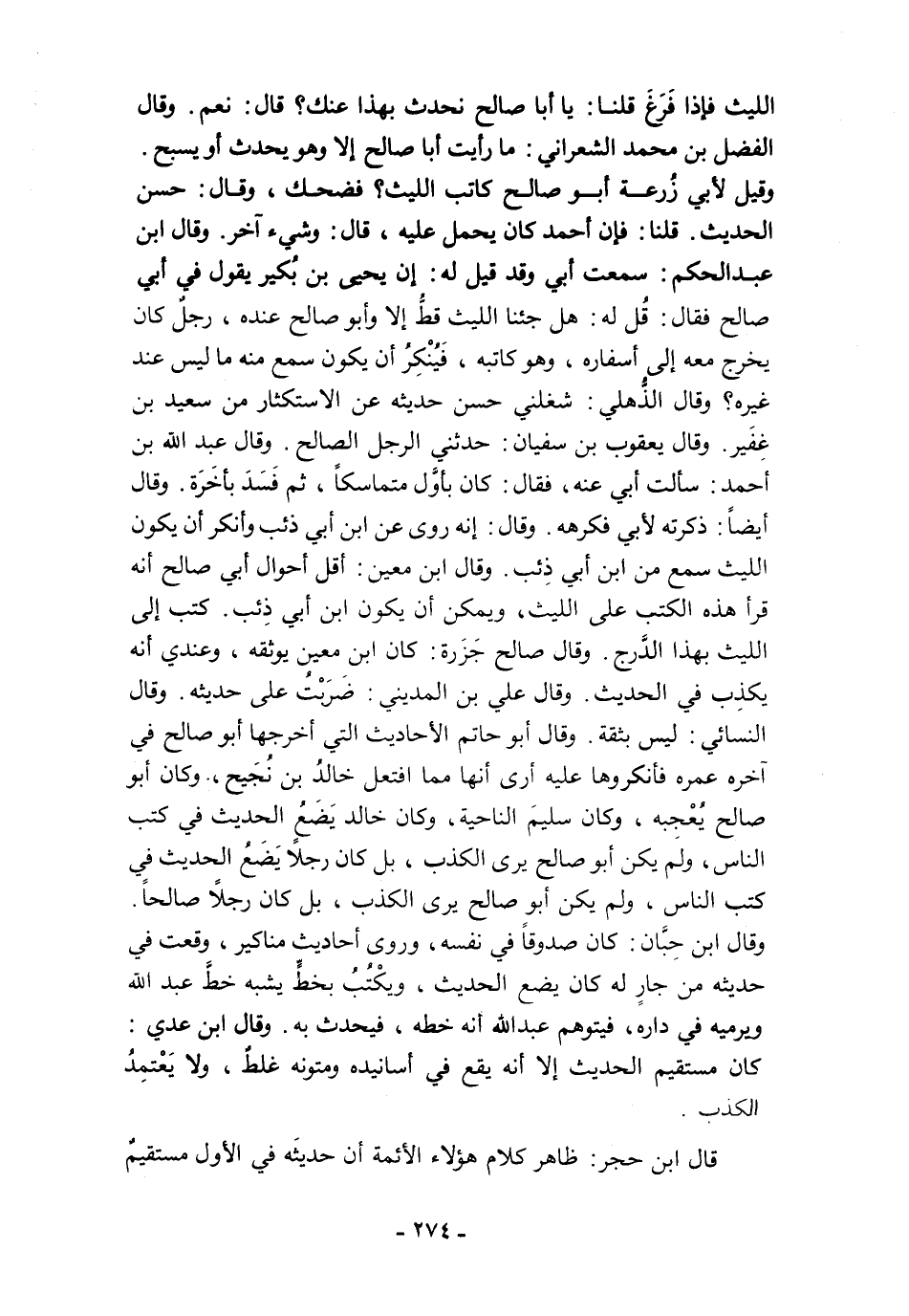 الليث فإذا فَرَغَ قلنا: يا أبا صالح نحدث بهذا عنك؟ قال: نعم. وقال الفضل بن محمَّد الشعراني: ما رأيت أبا صالح إلا وهو يحدث أو يسبح.