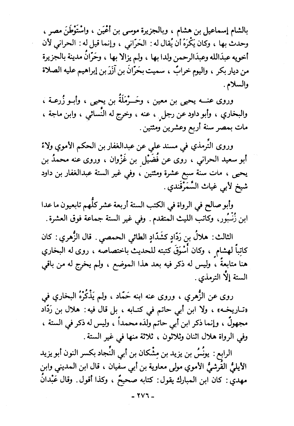 الثالث: هلالُ بن رَدّادٍ كشَدّادٍ الطائي الحمصي. قال الزُّهري: كان كاتِبًا لهشامٍ، وكان أَسْوَقَ كتبته للحديث باختصاصه، روى له البخاري هنا متابعةً، وليس له ذكر فيه بعد هذا الموضع، ولم يخرج له من باقي الستة إلَّا الترمذي.