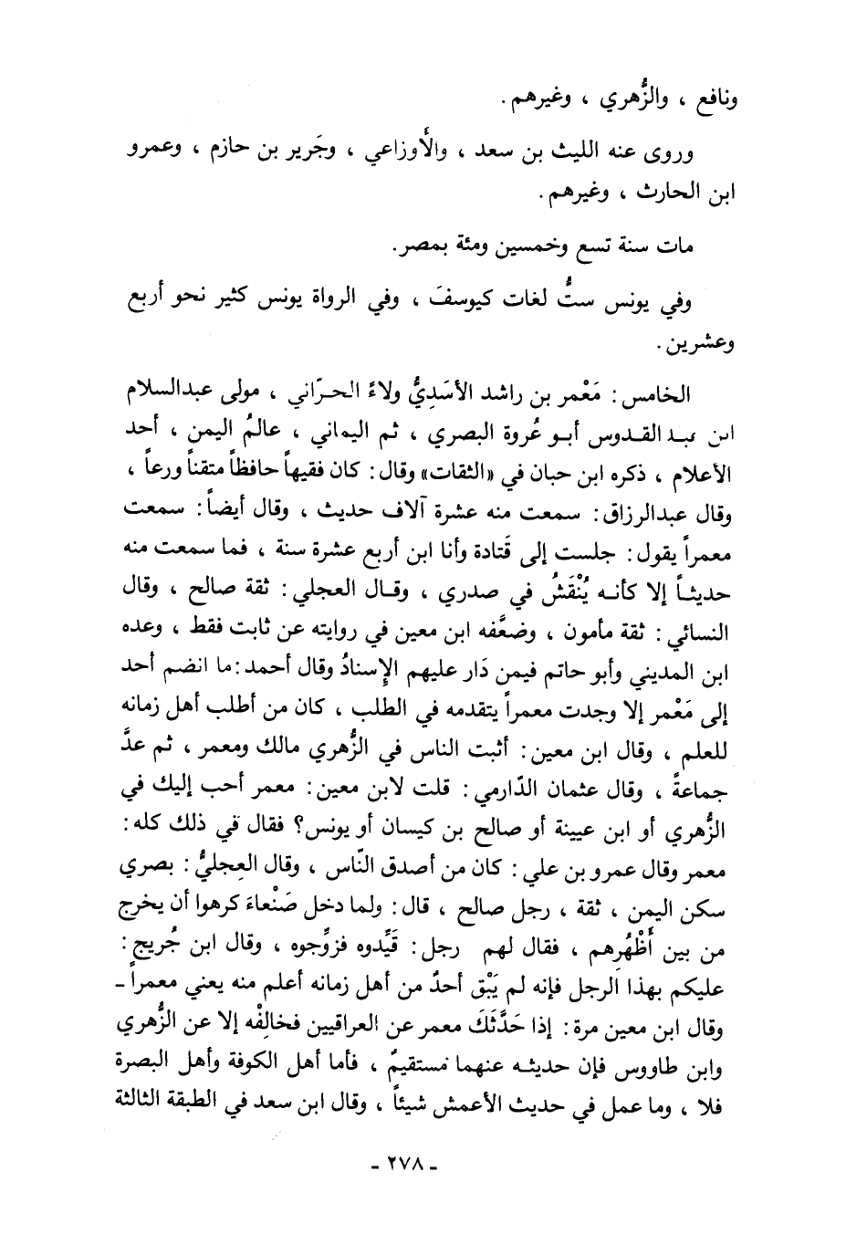 الخامس: مَعْمر بن راشد الأسَدِيُّ ولاءً الحرّاني، مولى عبد السلام ابن عبد القدوس أبو عُروة البصري، ثم اليماني، عالمُ اليمن، أحد الأعلام، ذكره ابن حبان في "الثقات" وقال: كان فقيهًا حافظًا متقنًا ورعًا، وقال عبد الرزاق: سمعت منه عشرة آلاف حديث، وقال أيضًا: سمعت معمرًا يقول: جلست إلى قَتادة وأنا ابن أربع عشرة سنة، فما سمعت منه حديثًا إلا كأنه يُنْقَشُ في صدري، وقال العجلي: ثقة صالح، وقال النسائي: ثقة مأمون، وضعَّفه ابن معين في روايته عن ثابت فقط، وعده ابن المديني وأبو حاتم فيمن دَار عليهم الإِسنادُ وقال أحمد: ما انضم أحد إلى مَعْمر إلا وجدت معمرًا يتقدمه في الطلب، كان من أطلب أهل زمانه للعلم، وقال ابن معين: أثبت الناس في الزُّهري مالك ومعمر، ثم عدَّ جماعة، وقال عثمان الدّارمي: قلت لابن معين: معمر أحب إليك في الزُّهري أو ابن عيينة أو صالح بن كيسان أو يونس؟ فقال في ذلك كله: معمر وقال عمرو بن علي: كان من أصدق الناس، وقال العِجليُّ: بصري سكن اليمن، ثقة، رجل صالح، قال: ولما دخل صَنْعاءَ كرهوا أن يخرج من بين أَظْهُرِهم، فقال لهم رجل: قَيِّدوه فزوِّجوه، وقال ابن جُريج: عليكم بهذا الرجل فإنه لم يَبْق أحدٌ من أهل زمانه أعلم منه يعني معمرًا- وقال ابن معين مرة: إذا حَدَّثَكَ معمر عن العراقيين فخالِفْه إلا عن الزُّهري وابن طاووس فإن حديثه عنهما مستقيمٌ، فأما أهل الكوفة وأهل البصرة فلا، وما عمل في حديث الأعمش شيئًا، وقال ابن سعد في الطبقة الثالثة