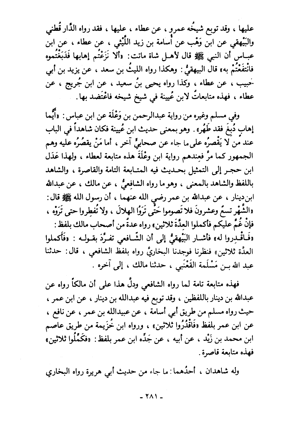وفي مسلم وغيره من رواية عبد الرحمن بن وَعْلَة عن ابن عباس: "أَيُّما إهابٍ دُبِغَ فقد طَهُر". وهو بمعنى حديث ابن عُيينة فكان شاهدًا في الباب عند من لا يَقْصرُه على ما جاء عن صحابيٍّ آخر، أما مَنْ يقصُرُه عليه وهم الجمهور كما مرَّ فعِندهم رواية ابن وعْلَةَ هذه متابعة لعطاء، ولهذا عَدَل ابن حجر إلى التمثيل بحديث فيه المتابعة التامة والقاصرة، والشاهد باللفظ والشاهد بالمعنى، وهو ما رواه الشافِعيُّ، عن مالك، عن عبد الله ابن دينار، عن عبد الله بن عمر رضي الله عنهما، أن رسول الله - صلى الله عليه وسلم - قال: "الشُّهْر تسعٌ وعشرونَ فلا تَصوموا حَتَّى تَرَوُا الهلالَ، ولا تُفطِروا حتى تَرَوْه، فإنْ غُمَّ عليكم فأكملوا العِدَّةَ ثلاثين" رواه عدة من أصحاب مالك بلفظ: "فَاقْدِروا له" فأشار البَيْهقيُّ إلى أن الشّافعي تفرد بقوله: "فَأَكملوا العدَّة ثلاثين" فنظرنا فوجدنا البخاريَّ رواه بلفظ الشافعي، قال: حدثنا عبد الله بن مَسْلَمة القَعْنَبي، حدثنا مالك، إلى آخره.