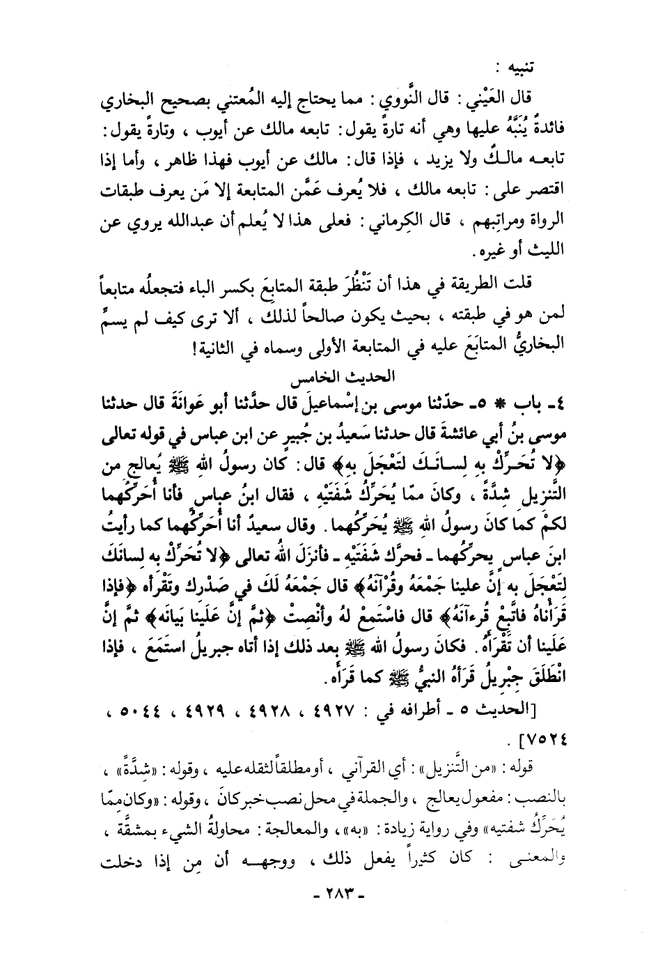 4 - باب * 5 - حَدَّثَنَا مُوسَى بْنُ إِسْمَاعِيلَ قَالَ حَدَّثَنَا أَبُو عَوَانَةَ قَالَ حَدَّثَنَا مُوسَى بْنُ أَبِي عَائِشَةَ قَالَ حَدَّثَنَا سَعِيدُ بْنُ جُبَيْرٍ عَنِ ابْنِ عَبَّاسٍ فِى قَوْلِهِ تَعَالَى {لَا تُحَرِّكْ بِهِ لِسَانَكَ لِتَعْجَلَ بِهِ} قَالَ: كَانَ رَسُولُ اللَّهِ - صلى الله عليه وسلم - يُعَالِجُ مِنَ التَّنْزِيلِ شِدَّةً، وَكَانَ مِمَّا يُحَرِّكُ شَفَتَيْهِ، فَقَالَ ابْنُ عَبَّاسٍ فَأَنَا أُحَرِّكُهُمَا لَكُمْ كَمَا كَانَ رَسُولُ اللَّهِ - صلى الله عليه وسلم - يُحَرِّكُهُمَا. وَقَالَ سَعِيدٌ أَنَا أُحَرِّكُهُمَا كَمَا رَأَيْتُ ابْنَ عَبَّاسٍ يُحَرِّكُهُمَا -فَحَرَّكَ شَفَتَيْهِ- فَأَنْزَلَ اللَّهُ تَعَالَى {لَا تُحَرِّكْ بِهِ لِسَانَكَ لِتَعْجَلَ بِهِ (16) إِنَّ عَلَيْنَا جَمْعَهُ وَقُرْآنَهُ} قَالَ جَمْعُهُ لَهُ فِى صَدْرِكَ وَتَقْرَأَهُ {فَإِذَا قَرَأْنَاهُ فَاتَّبِعْ قُرْآنَهُ} قَالَ فَاسْتَمِعْ لَهُ وَأَنْصِتْ {ثُمَّ إِنَّ عَلَيْنَا بَيَانَهُ} ثُمَّ إِنَّ عَلَيْنَا أَنْ تَقْرَأَهُ. فَكَانَ رَسُولُ اللَّهِ - صلى الله عليه وسلم - بَعْدَ ذَلِكَ إِذَا أَتَاهُ جِبْرِيلُ اسْتَمَعَ، فَإِذَا انْطَلَقَ جِبْرِيلُ قَرَأَهُ النَّبِيُّ - صلى الله عليه وسلم - كَمَا قَرَأَهُ.