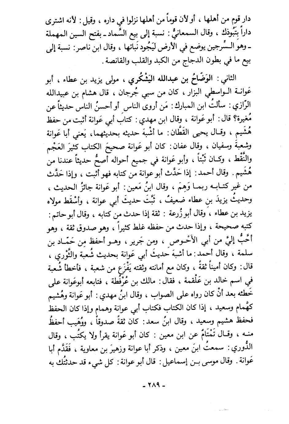 الثاني: الوَضّاحُ بن عبد الله اليَشْكُري، مولى يزيد بن عطاء، أبو عَوانة الواسطي البزار، كان من سبي جُرجان، قال هشام بن عبيد الله الرّازي: سألتُ ابن المبارك: مَن أروى الناسِ أو أحسنُ الناس حديثًا عن مُغيرة؟ قال: أبو عَوانة، وقال ابن مهدي: كتاب أبي عَوانة أثبت من حفظ هُشَيم، وقال يحيى القَطَّان: ما أشْبهَ حديثه بحديثهما، يَعني أبا عَوانة وشعبةَ وسفيان، وقال عفان: كان أبو عَوانة صحيحَ الكتاب كثيرَ العَجْم والنَّقْط، وكان ثَبْتًا، وأبو عَوانة في جميع أحواله أصحُّ حديثًا عندنا من هُشَيم. وقال أحمد: إذا حَدَّث أبو عوانة من كتابه فهو أثبت، وإذا حَدَّث من غير كتابه ربما وَهِمَ، وقال ابنُ مَعين: أبو عَوانة جائزُ الحديث، وحديثُ يزيدَ بنِ عطاء ضعيفٌ، ثَبَّتَ حديثَ أبي عوانة، وأسْقَط مولاه يزيد بن عطاء, وقال أبو زُرعة: ثقة إذا حدث من كتابه، وقال أبو حاتم: كتبه صحيحة، وإذا حدث من حفظه غلط كثيرًا، وهو صدوق ثقة، وهو أحَّبُّ إليَّ من أبي الأَحْوصِ، ومن جَرير، وهو أحفظ مِن حَمّاد بن سلمة، وقال أحمد: ما أشبهَ حديثَ أبي عَوانة بحديث شُعبة والثَّوْري، قال: وكان أمينًا ثقةً، وكان مع أمانته وثقته يَفْزَع من شعبة، فأخطأ شُعبة في اسم خالد بن عَلْقمة، فقال: مالك بن عُرْفُطة، فتابعه أبو عَوانة على خَطئه بعد أنْ كان رواه على الصواب، وقال ابنُ مهدي: أبو عَوانة وهُشيم كهَّمام وسعيد، إذا كان الكتاب فكتاب أبي عوانة وهمام وإذا كان الحفظ فحفظ هشيم وسعيد، وقال ابنُ سعد: كان ثقةً صدوقًا، ووُهَيب أحفظُ منه، وقال تَمْتَامٌ عن ابن معين: كان أبو عَوانة يقرأ ولا يكتُب، وقال الدُّوري: سمعتُ ابنَ معين، وذكر أبا عوانة وزهيرَ بن معاوية، فَقَدَّم أبا عَوانة. وقال موسى بن إسماعيل: قال أبو عوانة: كل شيء قد حدثتُك به