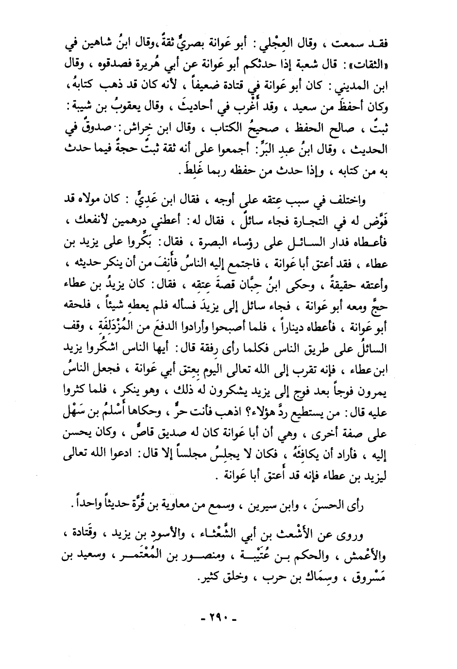 فقد سمعت، وقال العِجْلي: أبو عَوانة بصريٌّ ثقةٌ، وقال ابنُ شاهين في "الثقات": قال شعبة إذا حدثكم أبو عَوانة عن أبي هُريرة فصدقوه، وقال ابن المديني: كان أبو عَوانة في قتادة ضعيفًا, لأنه كان قد ذهب كتابهُ، وكان أحفظَ من سعيد، وقد أَغْرب في أحاديثَ، وقال يعقوبُ بن شيبة: ثبتٌ، صالح الحفظ، صحيحُ الكتاب، وقال ابن خِراش:. صدوقٌ في الحديث، وقال ابنُ عبدِ البَرِّ: أجمعوا على أنه ثقة ثبتٌ حجةٌ فيما حدث به من كتابه، وإذا حدث من حفظه ربما غَلِطَ.