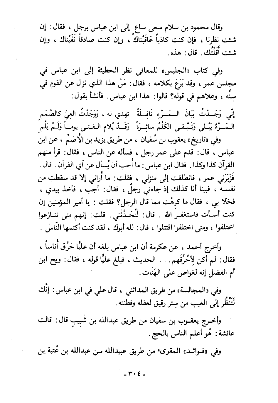 وأخرج أحمد، عن عكرمة أن ابن عباس بلغه أن عليًّا حَرَّق أُناسًا، فقال: لم أكن لِأحُرِّقَهم ... الحديث، فبلغ عليًّا قوله، فقال: ويح ابن أم الفضل إنه لغواص على الهَنَات.