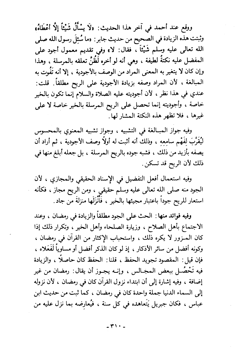 ووقع عند أحمد في آخر هذا الحديث: "لَا يسْأَلُ شَيْئًا إلَّا أعْطَاهُ" وثبتت هذه الزيادة في الصحيح من حديث جابر: "ما سُئِلَ رسول الله صلى الله تعالى عليه وسلم شَيْئًا، فقال: لا" وفي تقديم معمول أجود على المفضل عليه نكتةٌ لطيفة، وهي أنه لو أخره لَظُنَّ تعلقه بالمرسلة، وهذا وإن كان لا يتغير به المعنى المراد من الوصف بالأجودية، إلا أنه تَفُوت به المبالغة، لأن المراد وصفه بزيادة الأجودية على الريح مطلقًا. قلت: عندي في هذا نظر، لأن أجوديته عليه الصلاة والسلام إنما تكون بالخير خاصة، وأجوديته إنما تحصل على الريح المرسلة بالخير خاصة لا على غيرها، فلا تظهر هذه النكتة المشار لها.