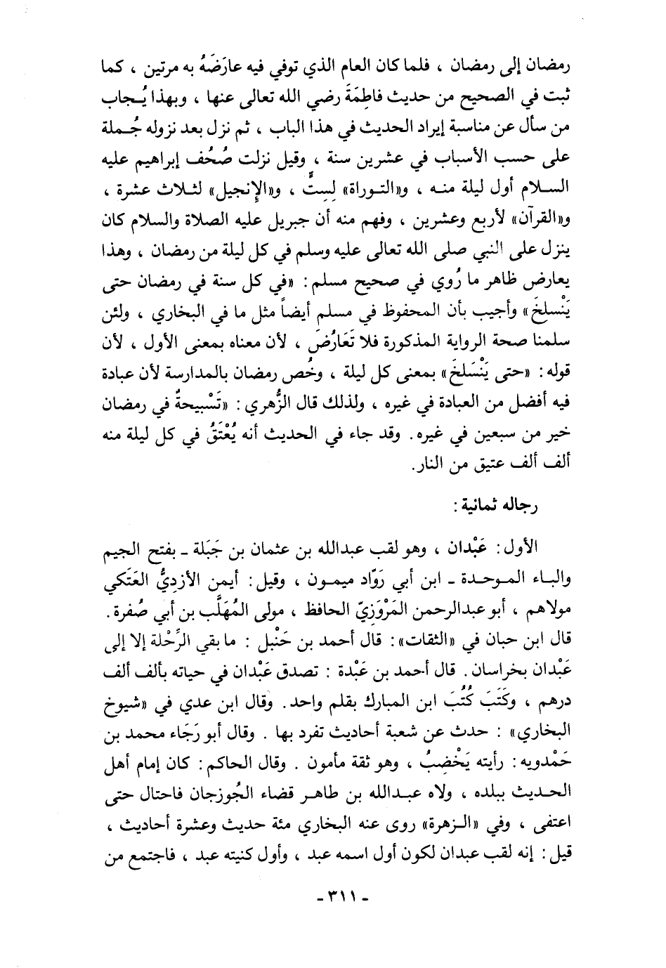 الأول: عَبْدان، وهو لقب عبد الله بن عثمان بن جَبَلة -بفتح الجيم والباء الموحدة- ابن أبي رَوّاد ميمون، وقيل: أيمن الأزدِيُّ العَتَكي مولاهم، أبو عبد الرحمن المَرْوَزِيّ الحافظ، مولى المُهَلَّب بن أبي صُفرة.