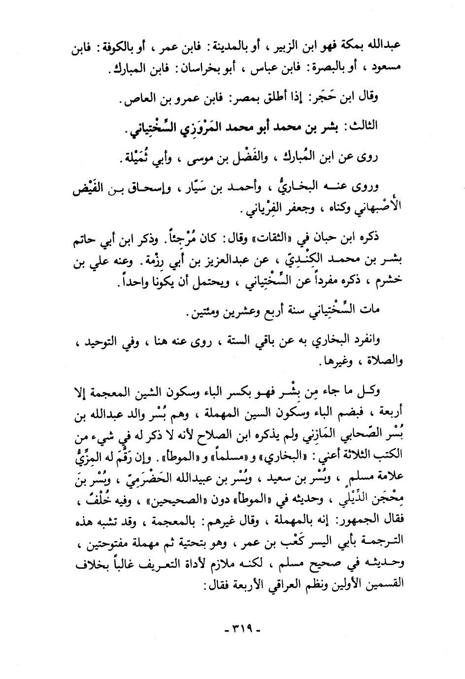 وكل ما جاء مِن بِشْر فهو بكسر الباء وسكون الشين المعجمة إلا أربعة، فبضم الباء وسكون السين المهملة، وهم بُسْر والد عبد الله بن بُسْر الصّحابي المَازِني ولم يذكره ابن الصلاح لأنه لا ذكر له فيٍ شيء من الكتب الثلاثة أعني: "البخاري" و"مسلمًا" و"الموطأ". وإن رَقَّمَ له المِزِّيُّ علامة مسلمٍ، وبُسْر بن سعيد، وبُسْر بن عبيد الله الحَضْرَمِيّ، وبُسْر بنَ مِحْجَن الدِّيْلي، وحديثه في "الموطأ" دون "الصحيحين"، وفيه خُلْفٌ، فقال الجمهور: إنه بالمهملة، وقال غيرهم: بالمعجمة، وقد تشبه هذه الترجمة بأبي اليسر كَعْب بن عمر، وهو بتحتية ثم مهملة مفتوحتين، وحديثه في صحيح مسلم، لكنه ملازم لأداة التعريف غالبًا بخلاف القسمين الأولين ونظم العراقي الأربعة فقال: