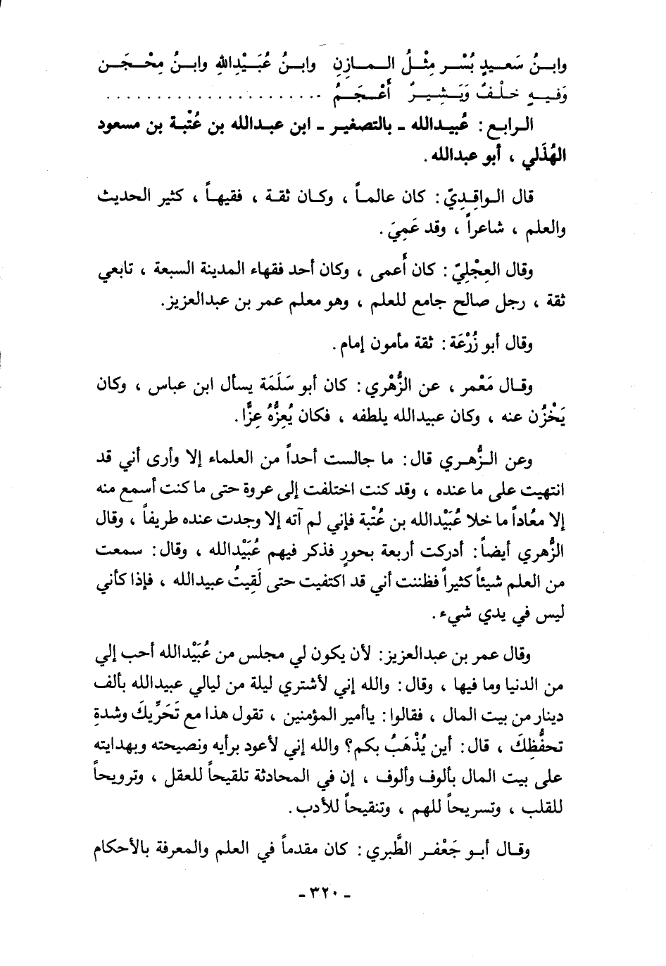 وعن الزُّهري قال: ما جالست أحدًا من العلماء إلا وأرى أني قد انتهيت على ما عنده، وقد كنت اختلفت إلى عروة حتى ما كنت أسمع منه إلا معُادًا ما خلا عُبَيْد الله بن عُتْبة فإني لم آته إلا وجدت عنده طريفًا، وقال الزُّهري أيضًا: أدركت أربعة بحورٍ فذكر فيهم عُبَيْد الله، وقال: سمعت من العلم شيئًا كثيرًا فظننت أني قد اكتفيت حتى لَقِيتُ عبيد الله، فإذا كأني ليس في يدي شيء.