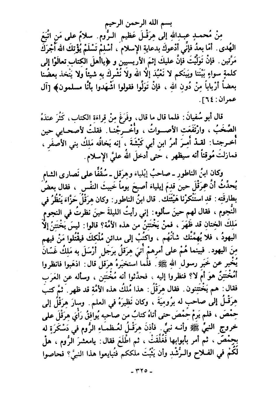 مِنْ مُحَمَّدٍ عَبْدِ اللَّهِ وَرَسُولِهِ إِلَى هِرَقْلَ عَظِيمِ الرُّومِ. سَلاَمٌ عَلَى مَنِ اتَّبَعَ الْهُدَى. أَمَّا بَعْدُ فَإِنِّي أَدْعُوكَ بِدِعَايَةِ الإِسْلاَمِ، أَسْلِمْ تَسْلَمْ يُؤْتِكَ اللَّهُ أَجْرَكَ مَرَّتَيْنِ. فَإِنْ تَوَلَّيْتَ فَإِنَّ عَلَيْكَ إِثْمَ الأَرِيسِيِّينَ وَ {قُلْ يَا أَهْلَ الْكِتَابِ تَعَالَوْا إِلَى كَلِمَةٍ سَوَاءٍ بَيْنَنَا وَبَيْنَكُمْ أَلَّا نَعْبُدَ إِلَّا اللَّهَ وَلَا نُشْرِكَ بِهِ شَيْئًا وَلَا يَتَّخِذَ بَعْضُنَا بَعْضًا أَرْبَابًا مِنْ دُونِ اللَّهِ فَإِنْ تَوَلَّوْا فَقُولُوا اشْهَدُوا بِأَنَّا مُسْلِمُونَ} [آل عمران: 64].