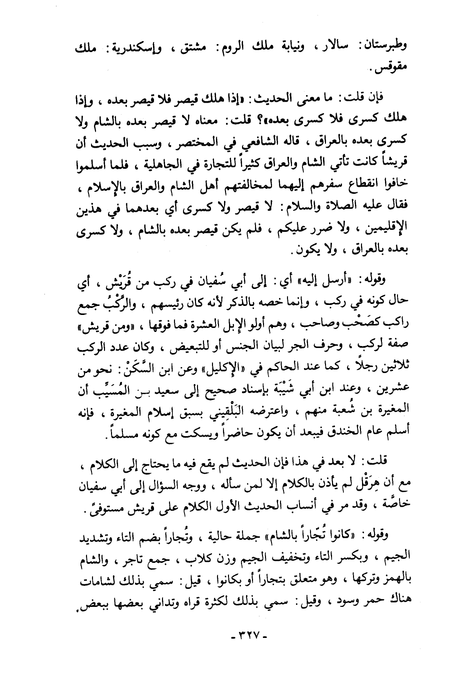 قلت: لا بعد في هذا فإن الحديث لم يقع فيه ما يحتاج إلى الكلام، مع أن هِرَقْل لم يأذن بالكلام إلا لمن سأله، ووجه السؤال إلى أبي سفيان خاصَّة، وقد مر في أنساب الحديث الأول الكلام على قريش مستوفىً.
