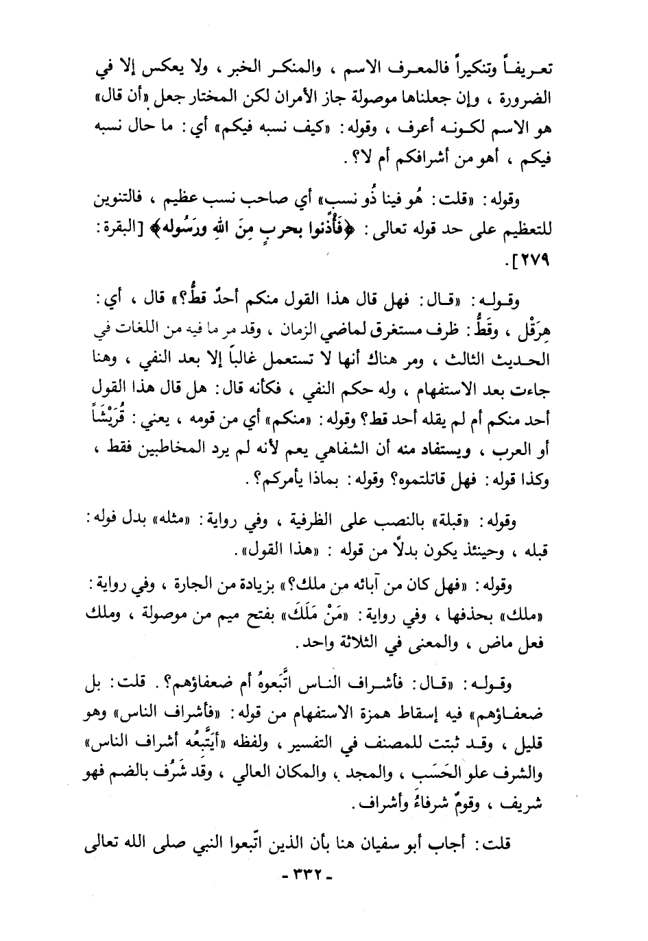 وقوله: "قلت: هُو فينا ذُو نسب" أي صاحب نسب عظيم، فالتنوين للتعظيم على حد قوله تعالى: {فَأْذَنُوا بِحَرْبٍ مِنَ اللَّهِ وَرَسُولِهِ} [البقرة:279].