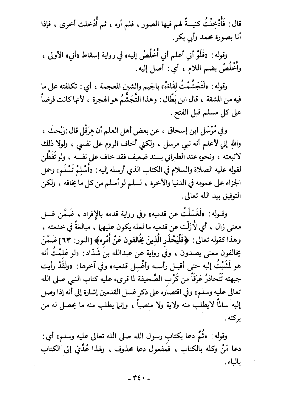 وفي مُرْسَل ابن إسحاق، عن بعض أهل العلم أن هِرَقْل قال: ويْحكَ، واللهِ إني لأعلم أنه نبي مرسل، ولكني أخاف الروم على نفسي، ولولا ذلك لاتبعته، ونحوه عند الطبراني بسند ضعيف فقد خاف على نفسه، ولو تَفَطَّن لقوله عليه الصلاة والسلام في الكتاب الذي أرسله إليه: "أَسْلِمْ تَسْلَم" وحمل الجزاء على عمومه في الدنيا والآخرة، لسلم لو أسلم من كل ما يخافه، ولكن التوفيق بيد الله تعالى.