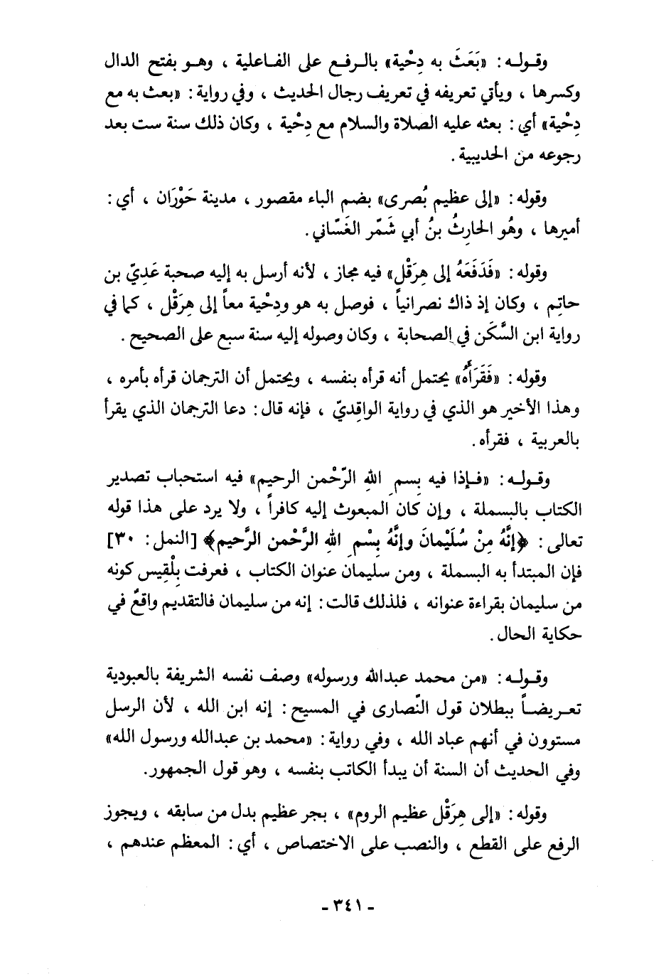 وقوله: "من محمَّد عبد الله ورسوله" وصف نفسه الشريفة بالعبودية تعريضًا ببطلان قول النصارى في المسيح: إنه ابن الله، لأن الرسل مستوون في أنهم عباد الله، وفي رواية: "محمَّد بن عبد الله ورسول الله" وفي الحديث أن السنة أن يبدأ الكاتب بنفسه، وهو قول الجمهور.