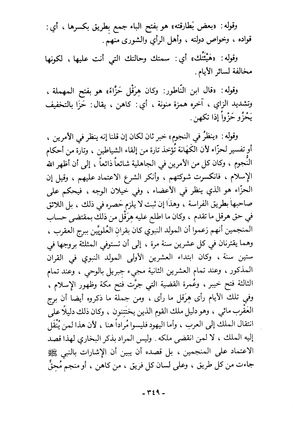 وقوله: "ينظُر في النجوم" خبر ثان لكان إن قلنا إنه ينظر في الأمرين، أو تفسير لحزّاء لأن الكَهَانة تُؤخذ تارة من إلقاء الشياطين، وتارة من أحكام النُّجوم، وكان كل من الأمرين في الجاهلية شائعًا ذائعًا، إلى أن أظهر الله الإِسلام، فانكسرت شوكتهم، وأنكر الشرع الاعتماد عليهم، وقيل إن الحزّاء هو الذي ينظر في الأعضاء، وفي خيلان الوجه، فيحكم على صاحبها بطريق الفراسة، وهذا إن ثبت لا يلزم حَصره في ذلك، بل اللائق في حق هرقل ما تقدم، وكان ما اطلع عليه هِرَقْل من ذلك بمقتضى حساب المنجمين أنهم زعموا أن المولد النبوي كان بقرانِ العُلويَّين ببرج العقرب، وهما يقترنان في كل عشرين سنة مرة، إلى أن تستوفي المثلثة بروجها في ستين سنة، وكان ابتداء العشرين الأولى المولد النبوي في القران المذكور، وعند تمام العشرين الثانية مجيء جِبريل بالوحي، وعند تمام الثالثة فتح خيبر، وعُمرة القضية التي جرَّت فتح مكة وظهور الإِسلام، وفي تلك الأيام رأى هِرَقل ما رأى، ومن جملة ما ذكروه أيضًا أن برج العَقْرب مائي، وهو دليل ملك القوم الذين يختَتِنون، وكان ذلك دليلًا على انتقال الملك إلى العرب، وأما اليهود فليسوا مُرادًا هنا، لأن هذا لمن يُنْقَل إليه الملك، لا لمن انقضى ملكه. وليس المراد بذكر البخاري لهذا قصد الاعتماد على المنجمين، بل قصده أن يبين أن الإِشارات بالنبي - صلى الله عليه وسلم - جاءت من كل طريق، وعلى لسان كل فريق، من كاهن، أو منجم مُحِقٍّ