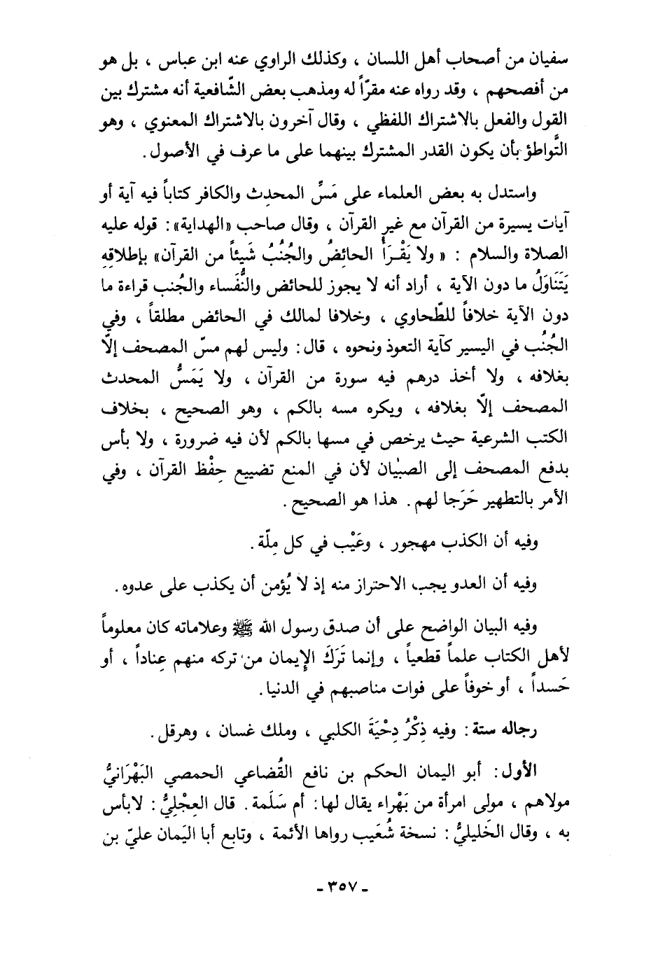 واستدل به بعض العلماء على مَسِّ المحدِث والكافر كتابًا فيه آية أو آيات يسيرة من القرآن مع غير القرآن، وقال صاحب "الهداية": قوله عليه الصلاة والسلام: "ولا يَقْرَأُ الحائِضُ والجُنُبُ شَيئًا من القرآن" بإطلاقِهِ يَتَنَاوَلُ ما دون الآية، أراد أنه لا يجوز للحائض والنُفَساء والجُنب قراءة ما دون الآية خلافًا للطّحاوي، وخلافا لمالك في الحائض مطلقًا، وفي الجُنُب في اليسير كآية التعوذ ونحوه، قال: وليس لهم مسُّ المصحف إلَّا بغلافه، ولا أخذ درهم فيه سورة من القرآن، ولا يَمسُّ المحدث المصحف إلَّا بغلافه، ويكره مسه بالكم، وهو الصحيح، بخلاف الكتب الشرعية حيث يرخص في مسها بالكم لأن فيه ضرورة، ولا بأس بدفع المصحف إلى الصبيان لأن في المنع تضييع حِفْظ القرآن، وفي الأمر بالتطهير حَرَجا لهم. هذا هو الصحيح.