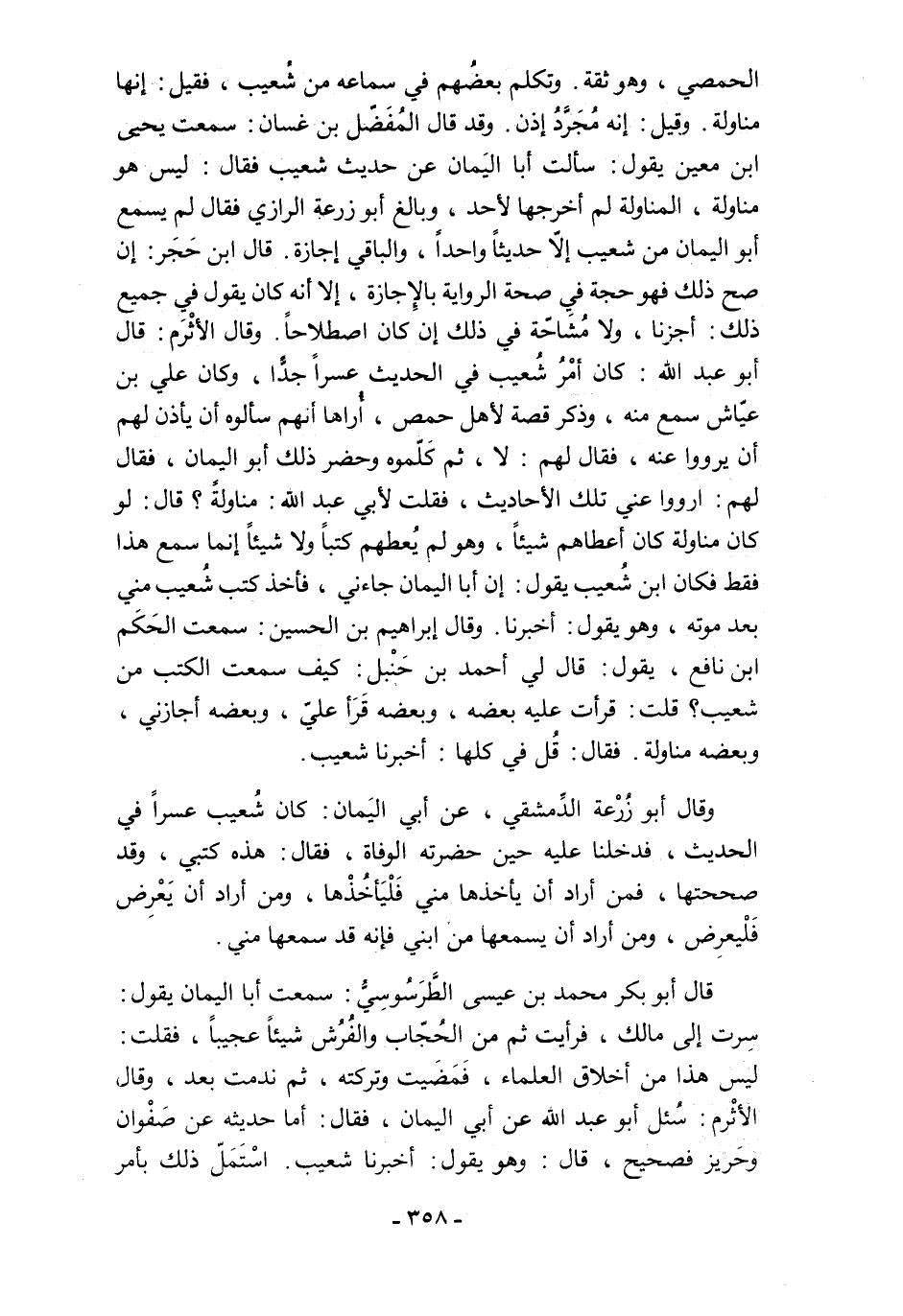 الحمصي، وهو ثقة. وتكلم بعضُهم في سماعه من شُعيب، فقيل: إنها مناولة. وقيل: إنه مُجَرَّدُ إذن. وقد قال المُفَضّل بن غسان: سمعت يحيى ابن معين يقول: سألت أبا اليَمان عن حديث شعيب فقال: ليس هو مناولة، المناولة لم أخرجها لأحد، وبالغ أبو زرعة الرازي فقال لم يسمع أبو اليمان من شعيب إلَّا حديثًا واحدًا، والباقي إجازة. قال ابن حَجَر: إن صح ذلك فهو حجة في صحة الرواية بالإِجازة، إلا أنه كان يقول في جميع ذلك: أجرنا، ولا مُشَاحّة في ذلك إن كان اصطلاحًا. وقال الأثْرَم: قال أبو عبد الله: كان أمْرُ شُعيب في الحديث عسرًا جدًّا، وكان علي بن عيّاش سمع منه، وذكر قصة لأهل حمص، أُراها أنهم سألوه أن يأذن لهم أن يرووا عنه، فقال لهم: لا، ثم كَلّموه وحضر ذلك أبو اليمان، فقال لهم: ارووا عني تلك الأحاديث، فقلت لأبي عبد الله: مناولةً؟ قال: لو كان مناولة كان أعطاهم شيئًا، وهو لم يُعطهم كتبًا ولا شيئًا إنما سمع هذا فقط فكان ابن شُعيب يقول: إن أبا اليمان جاءني، فأخذ كتب شُعيب مني بعد موته، وهو يقول: أخبرنا. وقال إبراهيم بن الحسين: سمعت الحَكَم ابن نافع، يقول: قال لي أحمد بن حَنْبل: كيف سمعت الكتب من شعيب؟ قلت: قرأت عليه بعضه، وبعضه قَرَأ عليّ، وبعضه أجازني، وبعضه مناولة. فقال: قُل في كلها: أخبرنا شعيب.